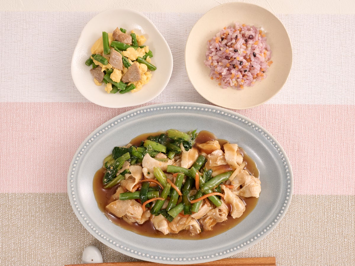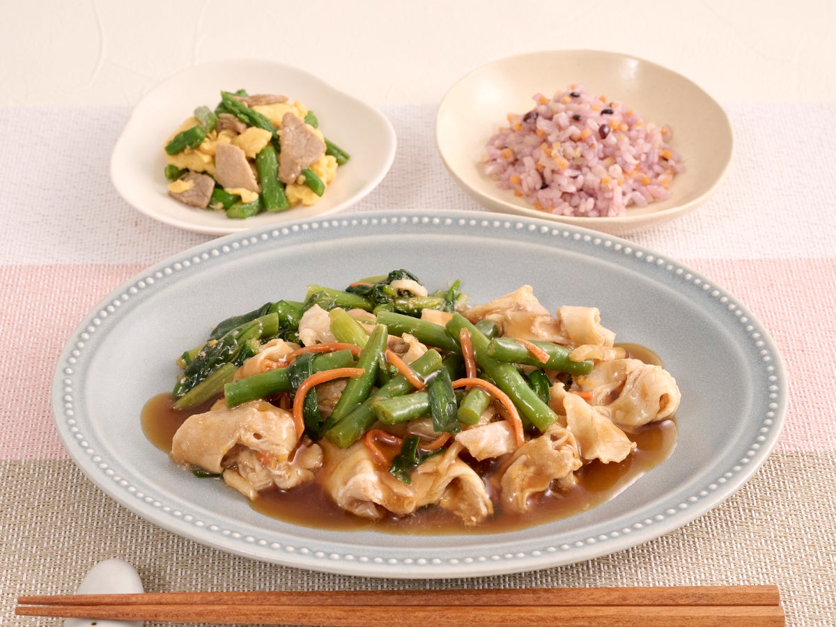 副菜は、甘酢で味付けしたアスパラたまご、黒米入りのもち麦ごはんです。