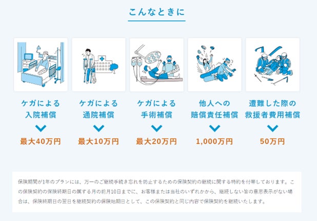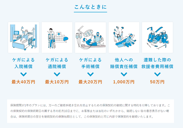 「スマ Qsnow」では、傷害補償よりスキー・スノーボード中のお怪我による入院・通院・手術補償の他、他人との事故における賠償責任補償や、遭難した際の救援補償等、幅広い場面に適応しております。また、屋内スキー場、パークやツリーラン、コース外でのケガ*にも対応しており、誰でも安心してスキー場を利用していただけます。