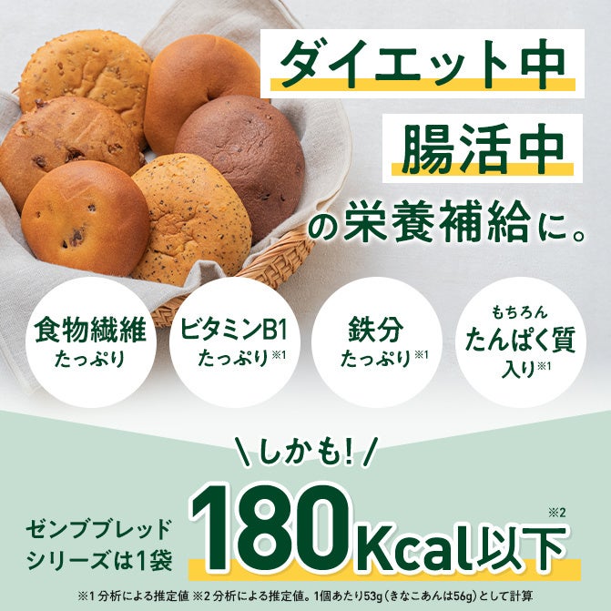 ※2 いつものパンと比べて糖質26%オフ。くるみ&レーズン(糖質27.6g/100g):くるみパン・ぶどうパン平均、カカオ(糖質32.9g/100g)、紅茶オレンジ(糖質34.0g/100g)、金時豆(糖質38.8g/100g):菓子パン(あんなし)。きなこあん(糖質32.3g/100g):菓子パン(こしあん入り)。出典:日本食品標準成分表2020年。3種の雑穀(糖質24.8g/100g):食パンと比べて。出典:日本食品標準成分表2015年。分析による推定値。