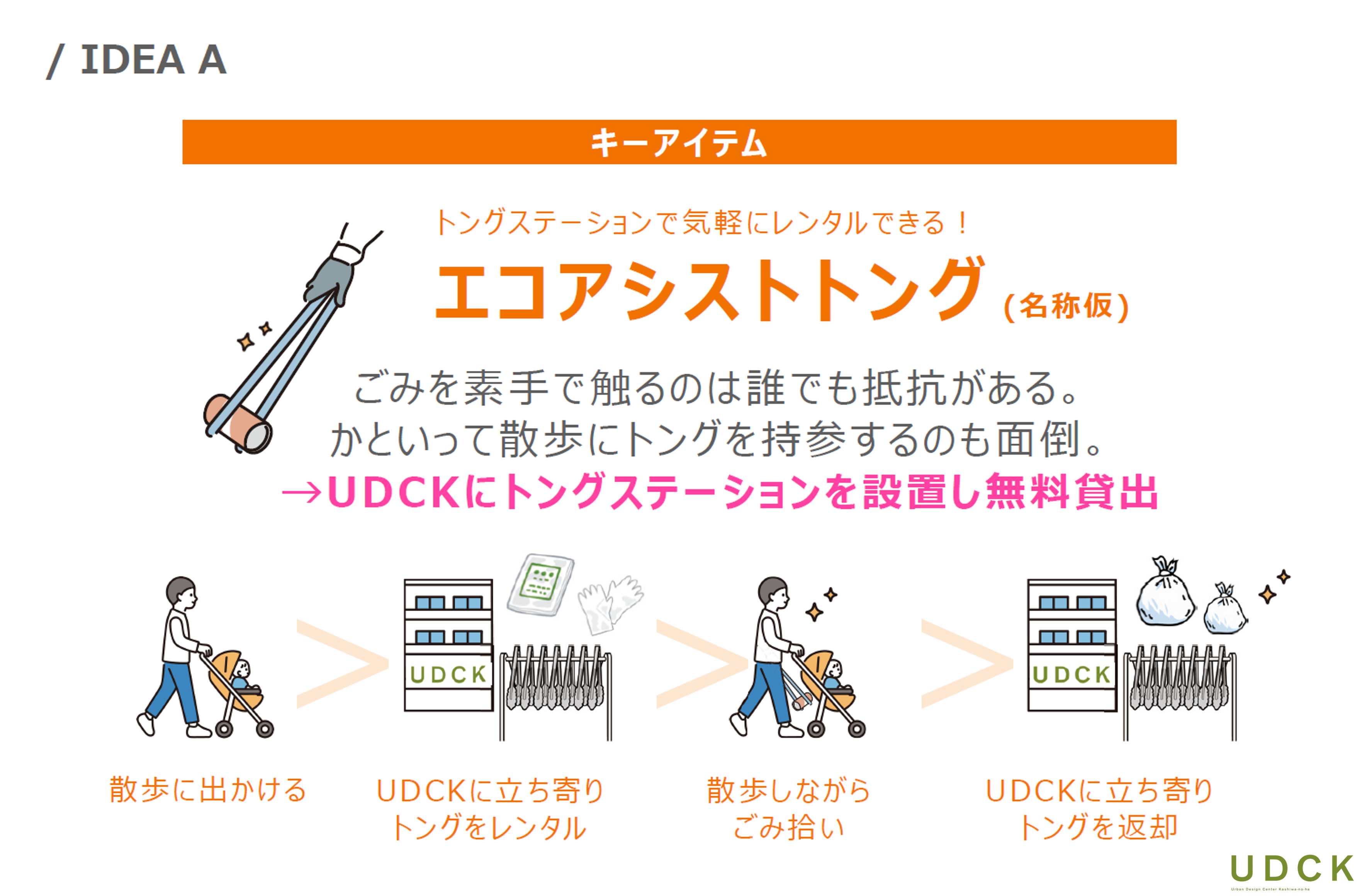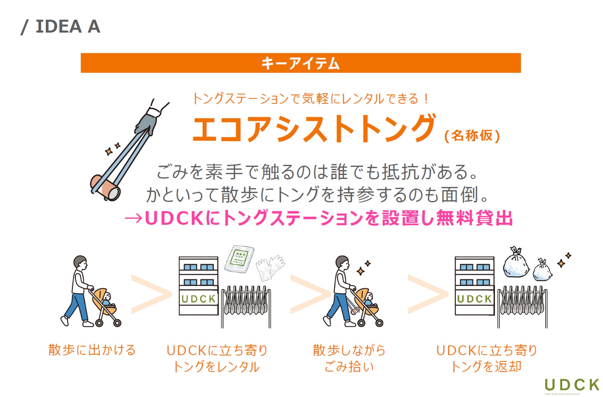 散歩のスポットでゴミ拾い用のトングが気軽にレンタルできる「エコアシストトング」をキーとしたアイデアを創出。拾ったゴミの量や種類の街頭サイネージ等での発信、拾った量に応じた貢献度合いの可視化やプレゼント特典、街の見守りカメラと連動してゴミが多い場所を散歩するルートの自動生成など、公共設備との組み合わせによって、街全体で持続的に取り組める企画としました。