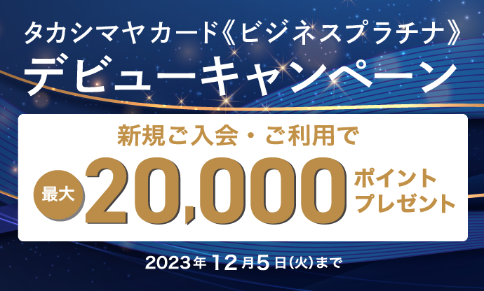内容:タカシマヤカード《ビジネスプラチナ》アメリカン・エキスプレス®の新規ご入会と、5万円(税込)以上のご利用で最大20,000ポイントをプレゼント。