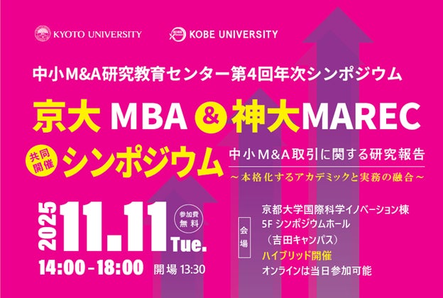 株式会社日本M&Aセンターホールディングス(以下、当社 / 本社:東京都千代田区 / 代表取締役社長:三宅 卓)と産学連携協定を締結する神戸大学大学院経営学研究科内の中小M&A研究教育センター(以下、MAREC / 所在地:兵庫県神戸市 / センター長:忽那 憲治)は、当社が寄附講座を開講している京都大学経営管理大学院とともに、2025年11月11日(火)に第4回年次シンポジウム「中小M&A取引に関する研究報告~本格化するアカデミックと実務の融合~」を共同開催いたします。
