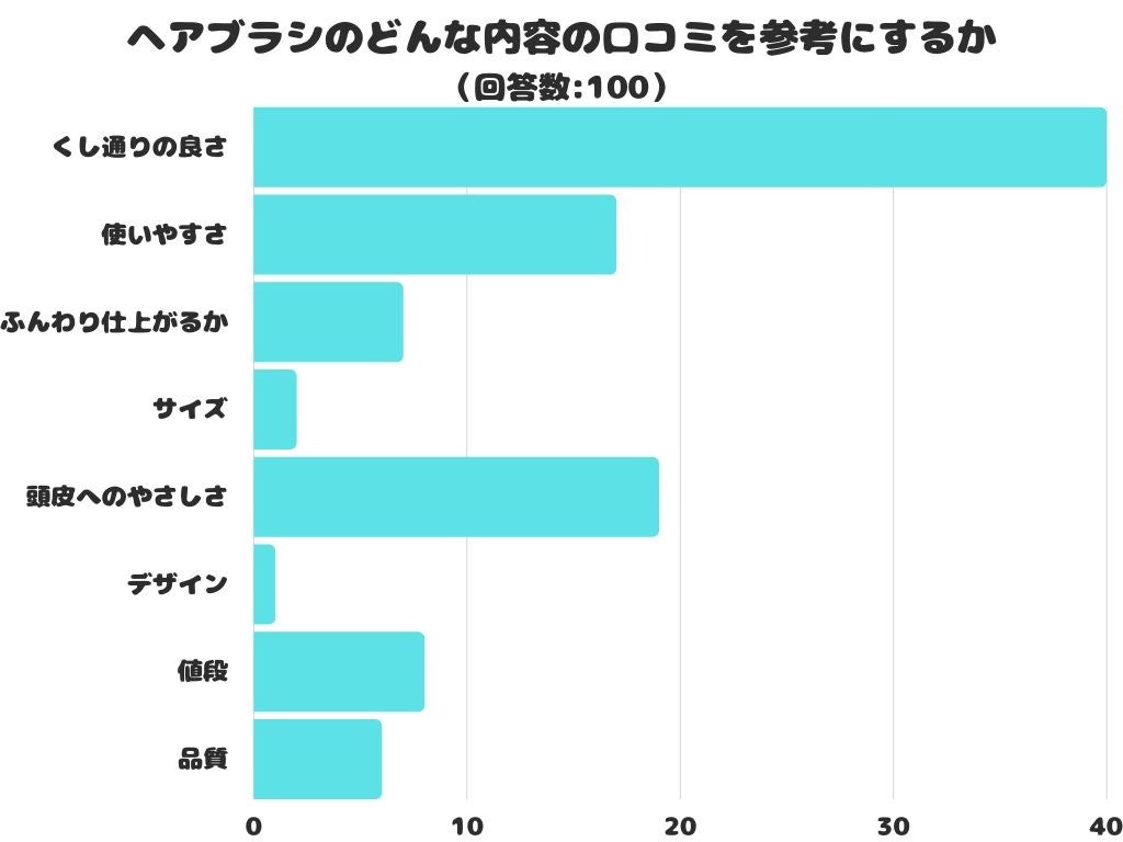 ヘアブラシのどんな内容の口コミを参考にするかをアンケートにて調査したところ、1位は「くし通りの良さ」でした。