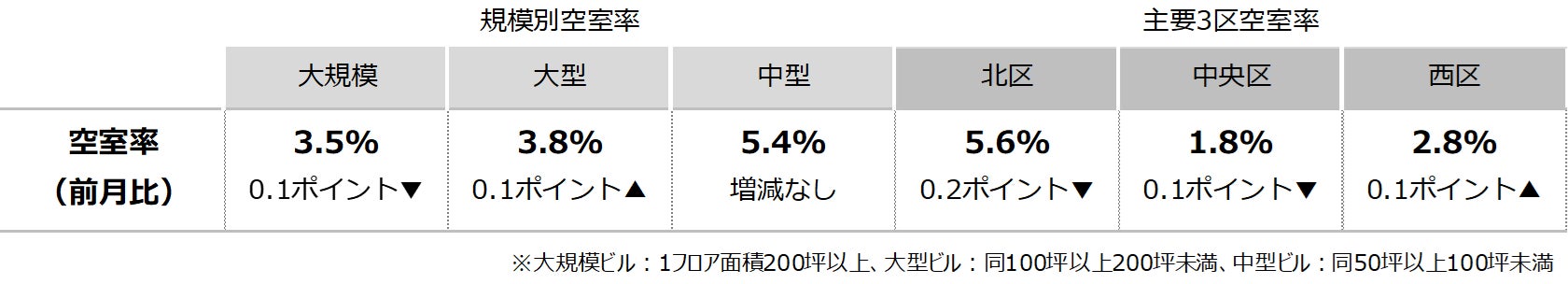 空室率は前月比マイナス0.09ポイントの3.47%となり、2ヵ月連続で低下した。新築・築浅ビルでテナント誘致が進んだことに加え、比較的大口の館内増床もあったことが主な低下要因となっている。潜在空室率は前月比プラス0.06ポイントの5.14%となった。