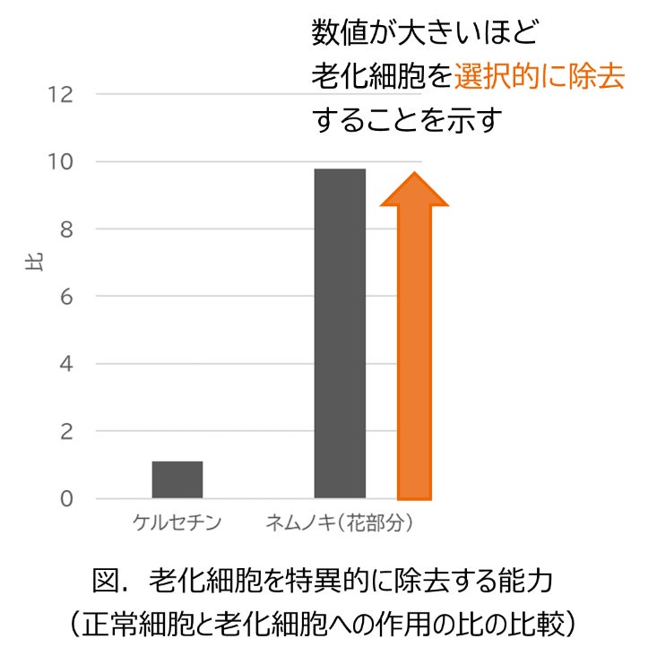 ヒト培養細胞の試験系で評価した結果、ネムノキ(花部分)は正常細胞(※2)に対し老化細胞を9.8倍効率よく取り除くことが示されました(図)。