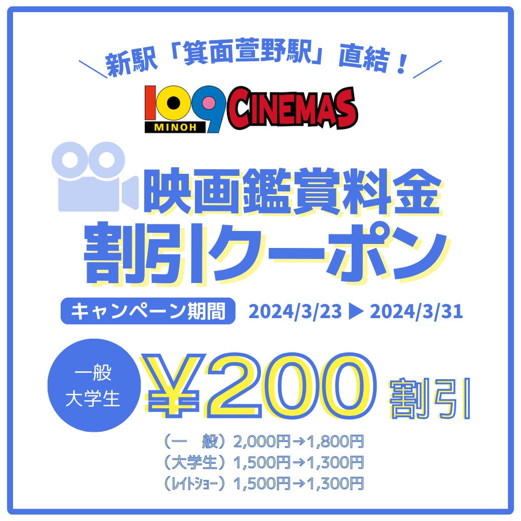 (土)~3月31日(日)の期間中に109シネマズ箕面で何度でも使用できる、鑑賞料金200円分割引クー