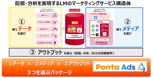 Ponta Adsでは、これらのソリューションをパッケージ化し、①活用するデータを選ぶ、②アプローチするメディアを選ぶ、③アウトプットを選ぶ、の形でサービスを再構築しました。