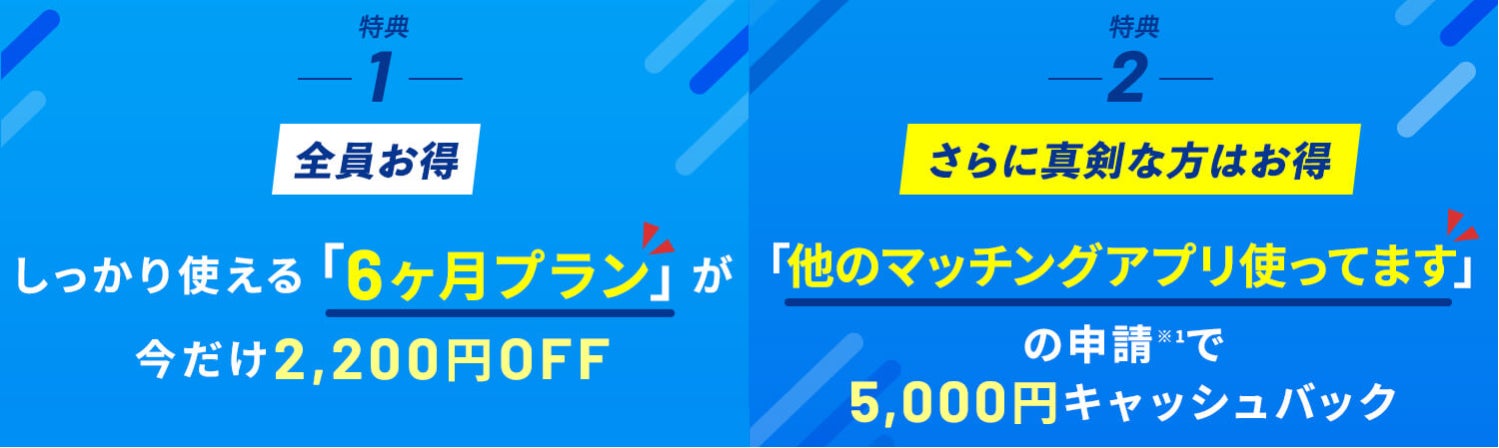 | 【特典内容】 (1)もれなく6ヶ月プランが2,200円OFF!( 15,600円→ 13,400円 ) (2)他のネット婚活・マッチングアプリで真剣に婚活している方は『5,000円キャッシュバック』 ※特典についての詳細は特設サイトをご確認ください。 |