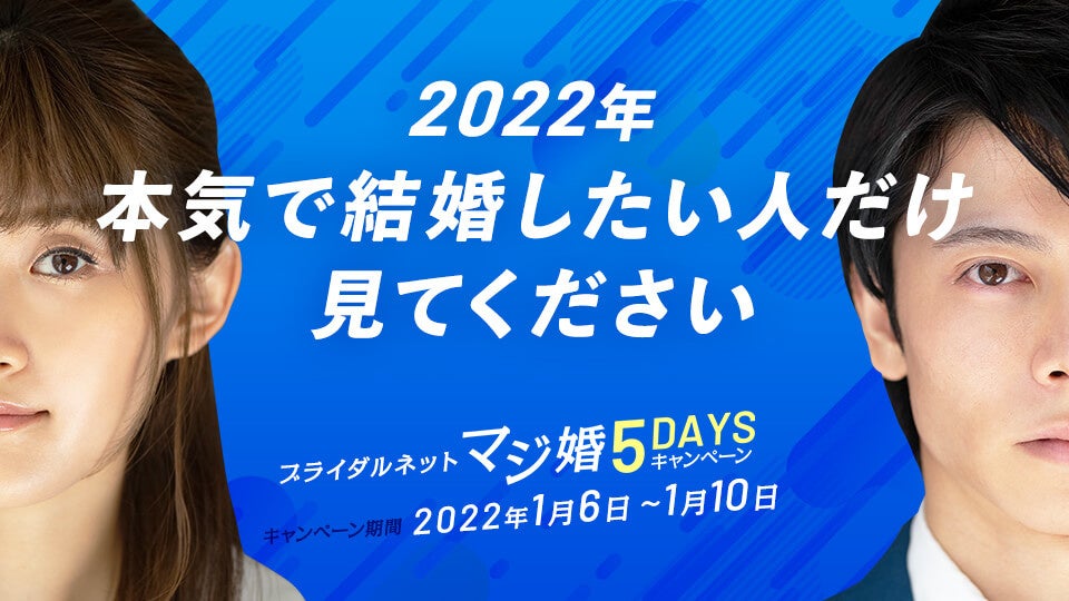 株式会社IBJ(代表取締役社長:石坂 茂、東証一部:6071)が運営する婚活サイトの『ブライダルネット』は、本日2022年1月6日(木)~10日(月・祝)の5日間限定『マジ婚5DAYS』キャンペーンを実施。ブライダルネットの6ヶ月プランがお得にスタートできる特典を設け、半年以内にお相手を見つけたい、本気(マジ)な皆様を応援します。