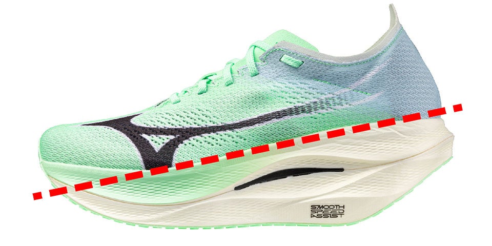 ミズノ独自のソール構造『SMOOTH SPEED ASSIST』を、シューズの用途に合わせ傾斜を抑えた仕様で搭載しています。それにより、ふくらはぎ周辺の筋肉にかかる負担を軽減、スムーズなミッドフット走法をアシストし、効率的に走ることができます※2。また、プレートを使用せず一体型ミッドソールにすることで、重さは約235g(27.0cm片方)と、「WAVE NEO WIND」に比べて約30g軽量になっています。底面の幅を広めに取ることで安定性も向上し、スピード練習からジョグまで幅広いペースに対応が可能です。