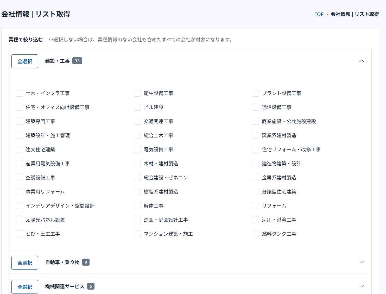 マルジュが保有する数十万件の企業データから30以上の業種、規模、地域を指定し問合せフォームURL付きの営業リストを取得する機能です。これからフォームDMマーケティングを始められる企業様や