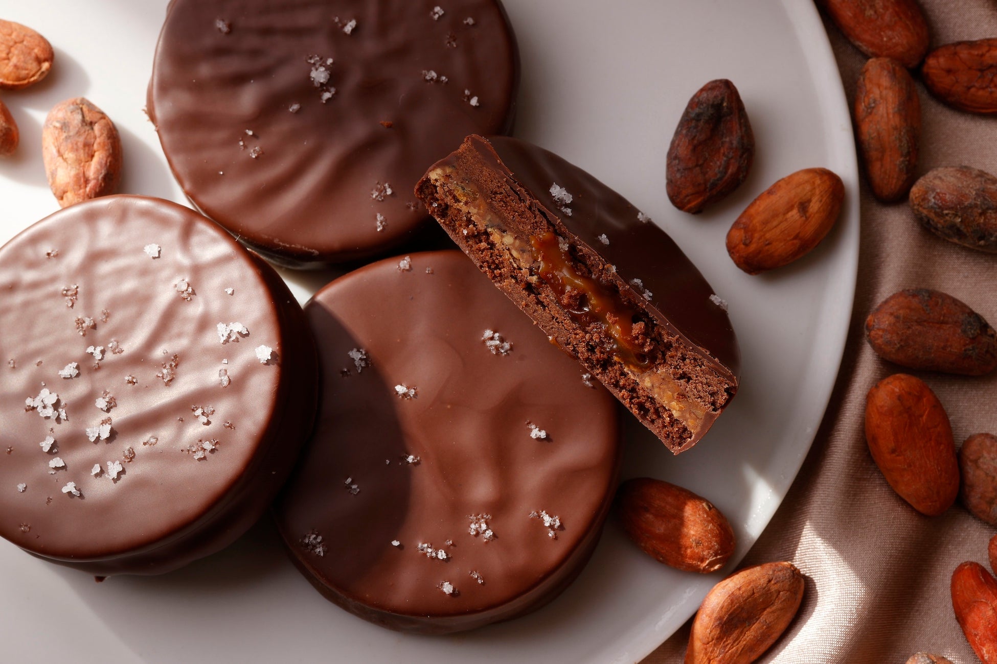 軽やかなカカオサブレ生地の中には、香り高い自家製アーモンドプラリネとキャラメルソースが忍ばせてあります。ベルギー産のチョコレートを使用し、最後に小笠原諸島の塩をひと振りしてアクセントを加えました。豊かな風味と絶妙な塩味のバランスが楽しめる一品です。
