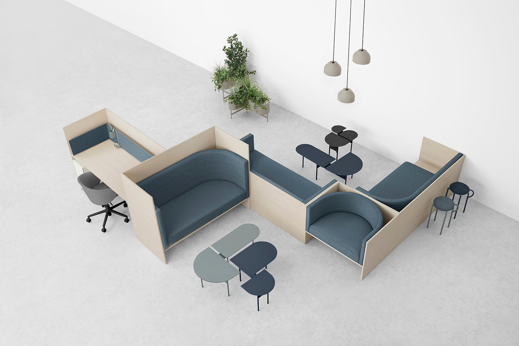 ・enKAKのアイテム数は300におよび、「en(円)」と「KAK(角)」を用いて、デスクやソファ、ブースやテーブルといった性質の異なるアイテムを自由に設置・組み合わせることが可能に。従来切り分けられていた「集中」や「コミュニケーション」といった異なる要素を融合させることができ、働く場に新しい価値を生み出します。
