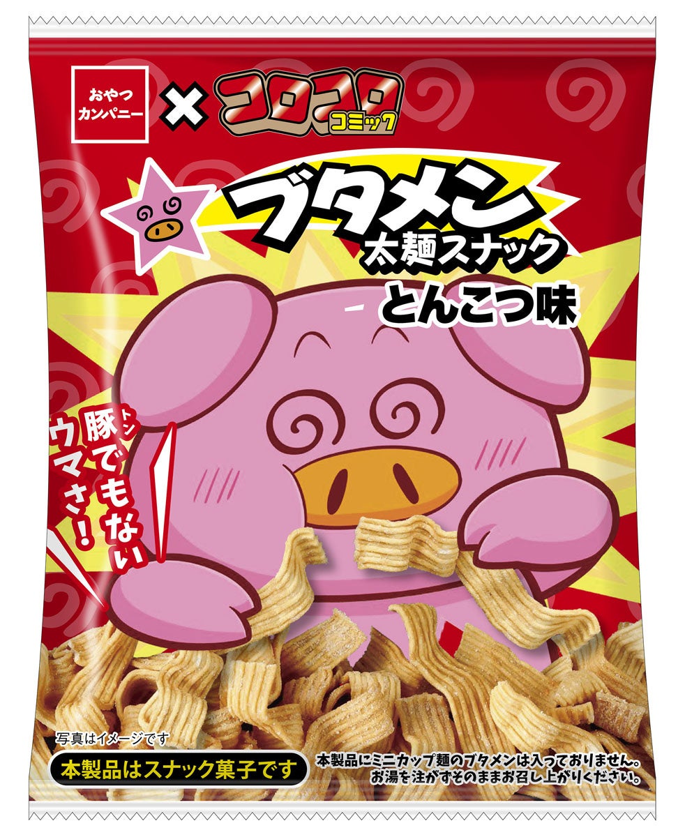『コロコロコミック』連載中の「ブタメンくん」パッケージが目を引く『ブタメン太麺スナック(とんこつ味)』発売