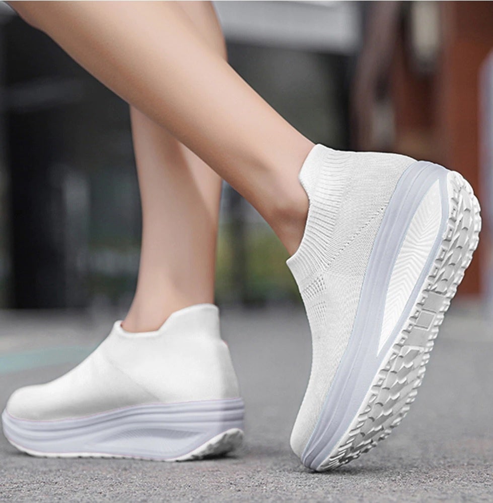 美脚見せの5㎝ヒールはエアー入りで歩きやすく、屈曲性抜群の船底型ソールで美姿勢に。ソックスのようなニット素材は通気性も◎