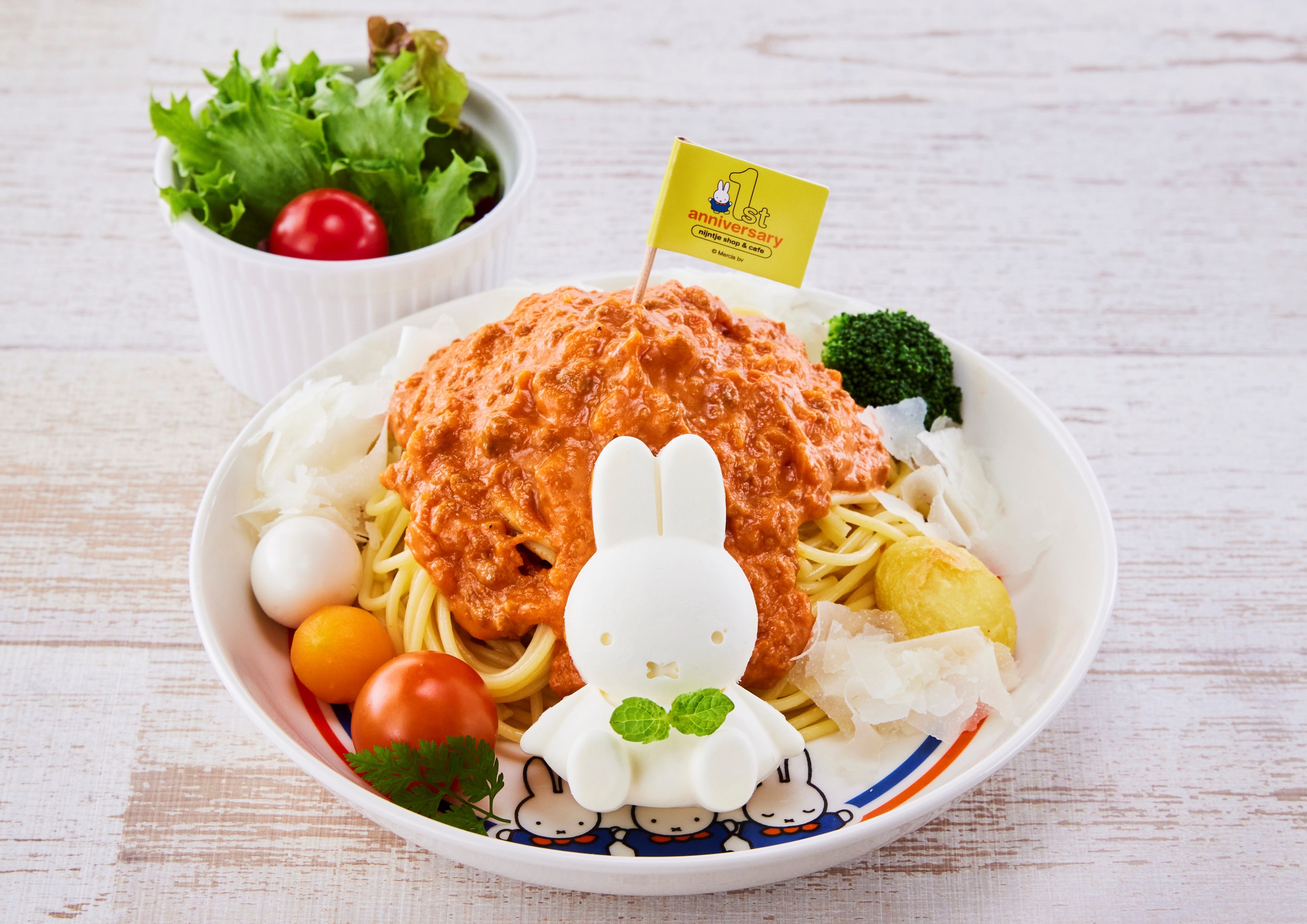 ショーやグリーティングに新しく登場する「メラニー」のメニューや、ミッフィーをかたどったかわいいチーズがのったスパゲッティなど、お腹も心も満たされるメニューが2024年3月14日まで期間限定で登場。また、ナインチェ(カフェ)をイメージしてフォークとスプーンを持ったミッフィーのグッズも登場し、ハウステンボスでしか手に入らない、かわいいミッフィーグッズであふれます。