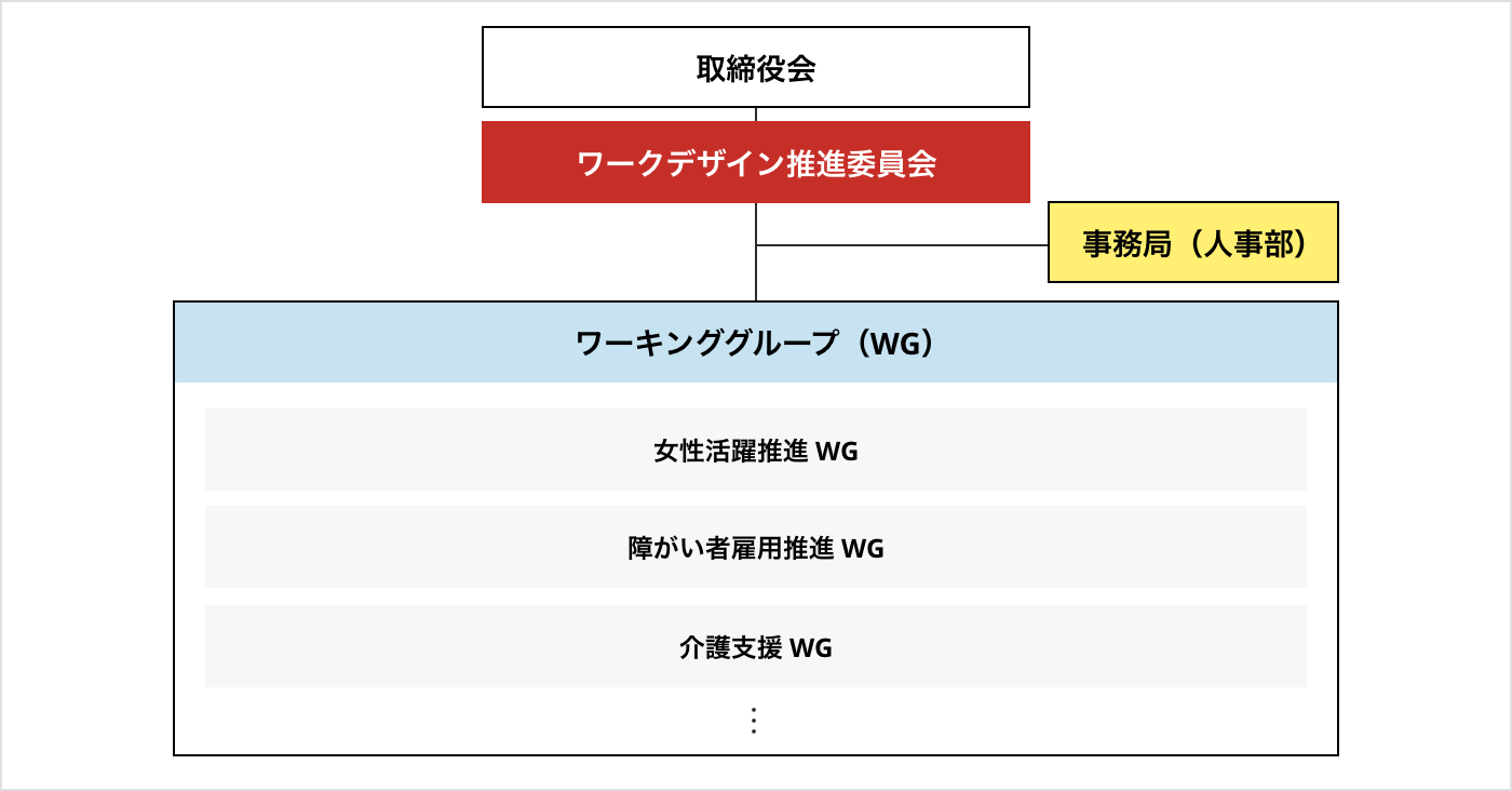 この度、従来それぞれ取り組んでいた、女性活躍推進や障がい者雇用といった各種テーマに関し、グループ横断で、一貫して強力に推進する体制整備のため、ワークデザイン推進委員会を設置し、管理職をリーダーとした各種ワーキンググループが、課題の掘り下げと対策、新たな推進策を実行してまいります。