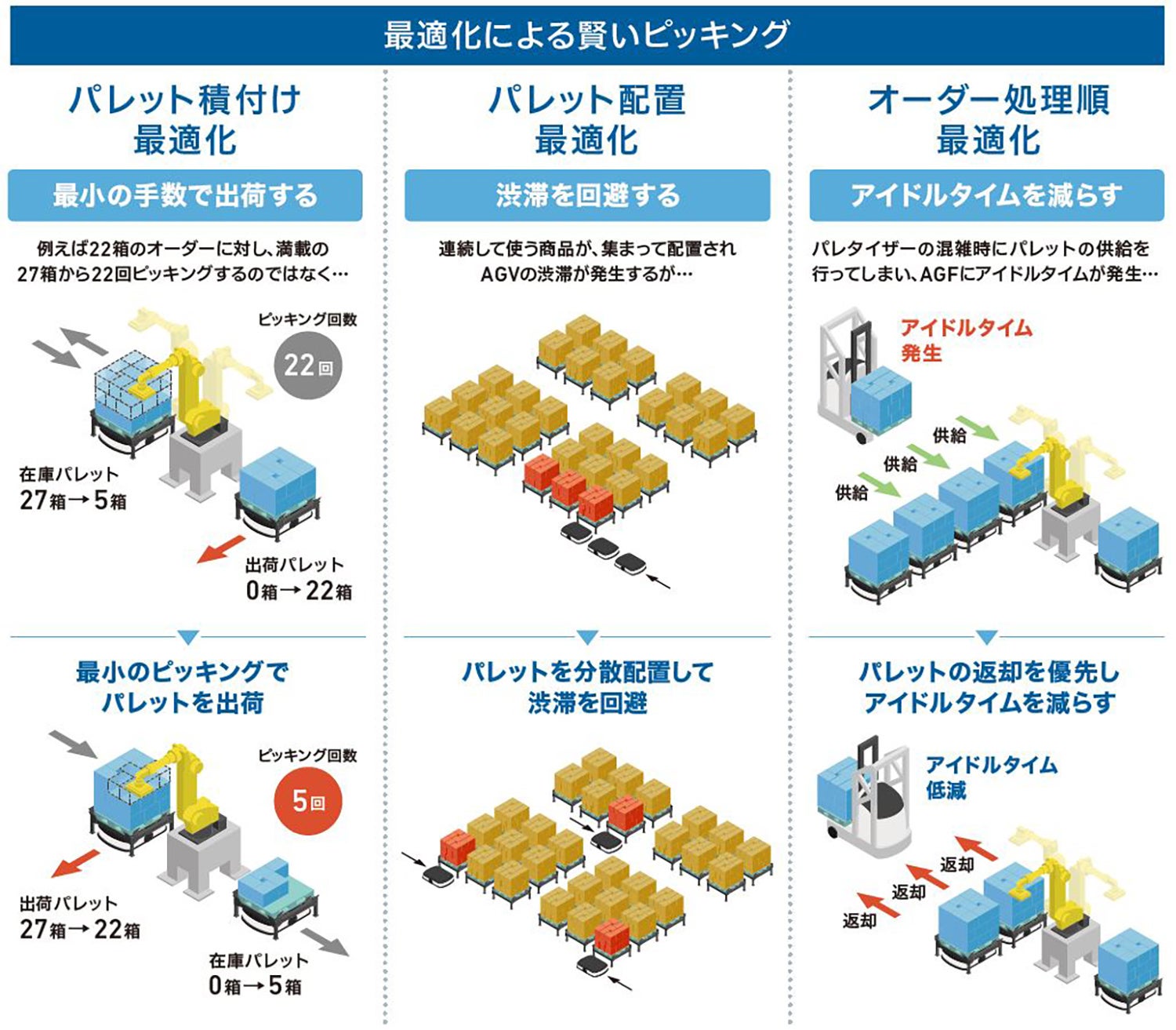この自動ピッキングソリューションは、ピッキング工程にAGF(Automated Guided Forklift:無人フォークリフト)、 AGV(Automated Guided Vehicle:無人搬送車)、パレタイザー※3を活用して作業を自動化する国内初のソリューションです。これまで作業者自身が効率化を考えながら行っていたピッキング作業を、三菱重工グループが開発したΣSynXによって自動化・知能化したもので、独自開発の最適化エンジンや統合制御システムによって、複数のAGF、AGV、パレタイザーを効率的に連携させて搬送・ピッキング回数を削減、ピッキング工程の最適化とスループット(処理能力)向上を実現しています。