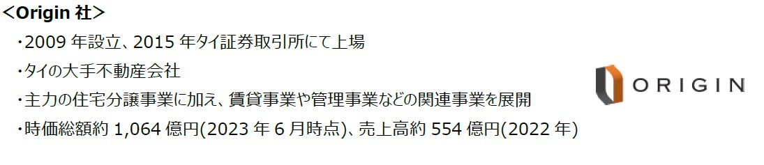 当社は2022年にOrigin社グループと戦略的提携合意書を締結し、タイにおける不動産開発事業の協力体制の更なる強化、拡大を確認しており、今後もタイにおいて着実な事業成長を目指してまいります。