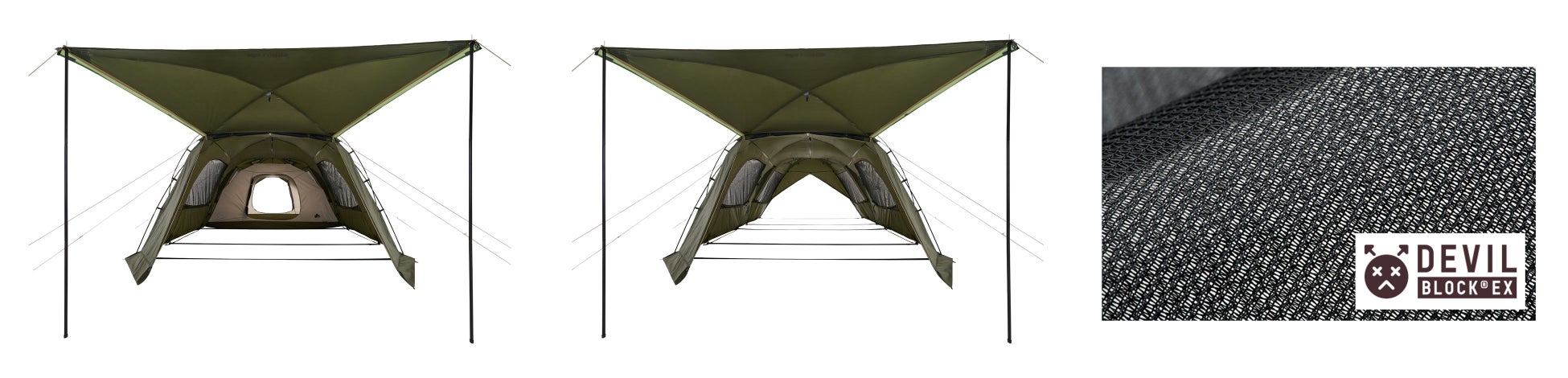 簡単に着脱できる吊り下げ式のインナーテントを取り外せば、フライシート単独でもスクリーンタープとして使用できます。フライシートには、LOGOS独自開発の高機能メッシュ「デビルブロックST」を採用しており、UV-CUT率・遮光率ともに通常比の約1.5倍を実現します。紫外線や強い日差し、虫の侵入を防ぎながら、テント内部に心地よい風だけを通すので、快適に過ごすことができます。
