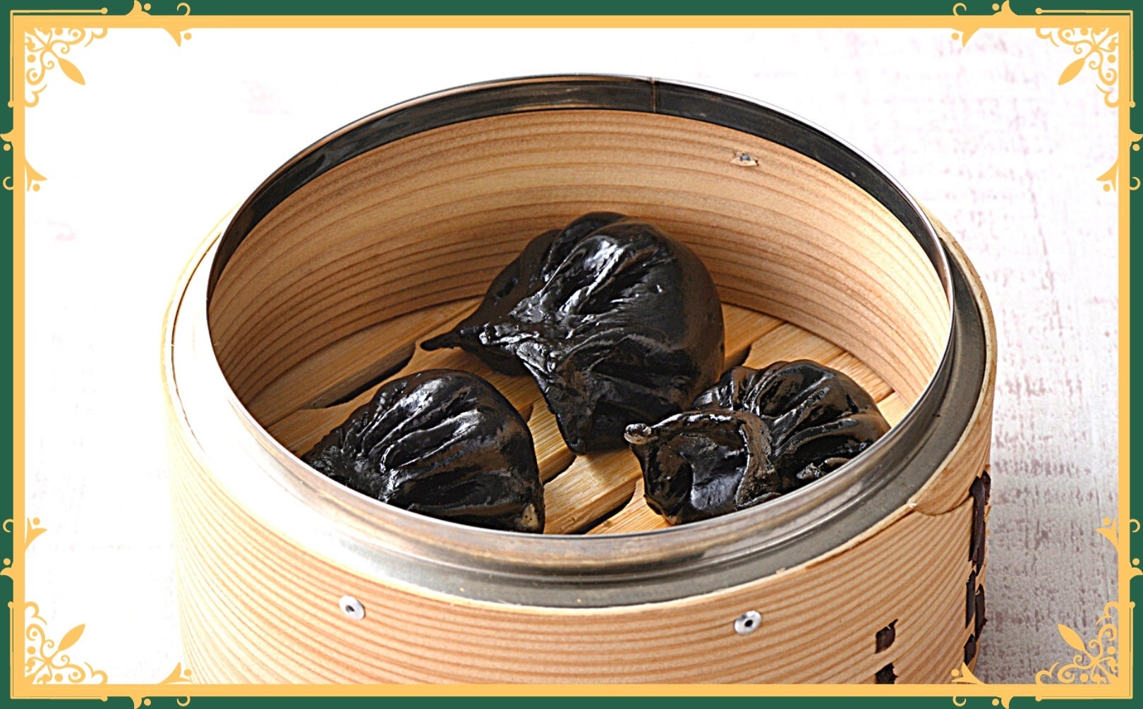 インパクト大の真っ黒なビジュアル!3大珍味の一つとし名高い、濃厚で芳醇なトリュフの風味が口の中に広がる『トリュフ入り餃子』。(プレミアムコース限定)