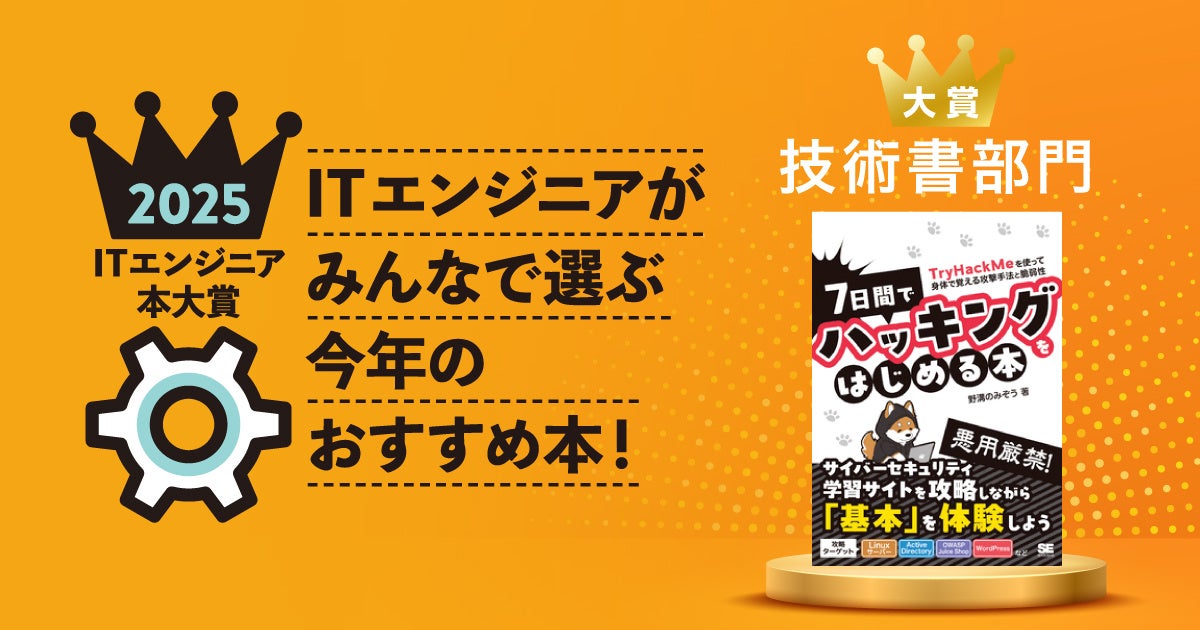 株式会社翔泳社(本社:東京都新宿区舟町5、社長:佐々木幹夫)が出版する『7日間でハッキングをはじめる本 TryHackMeを使って身体で覚える攻撃手法と脆弱性』が、「ITエンジニア本大賞2025」技術書部門大賞と特別賞に選ばれました。