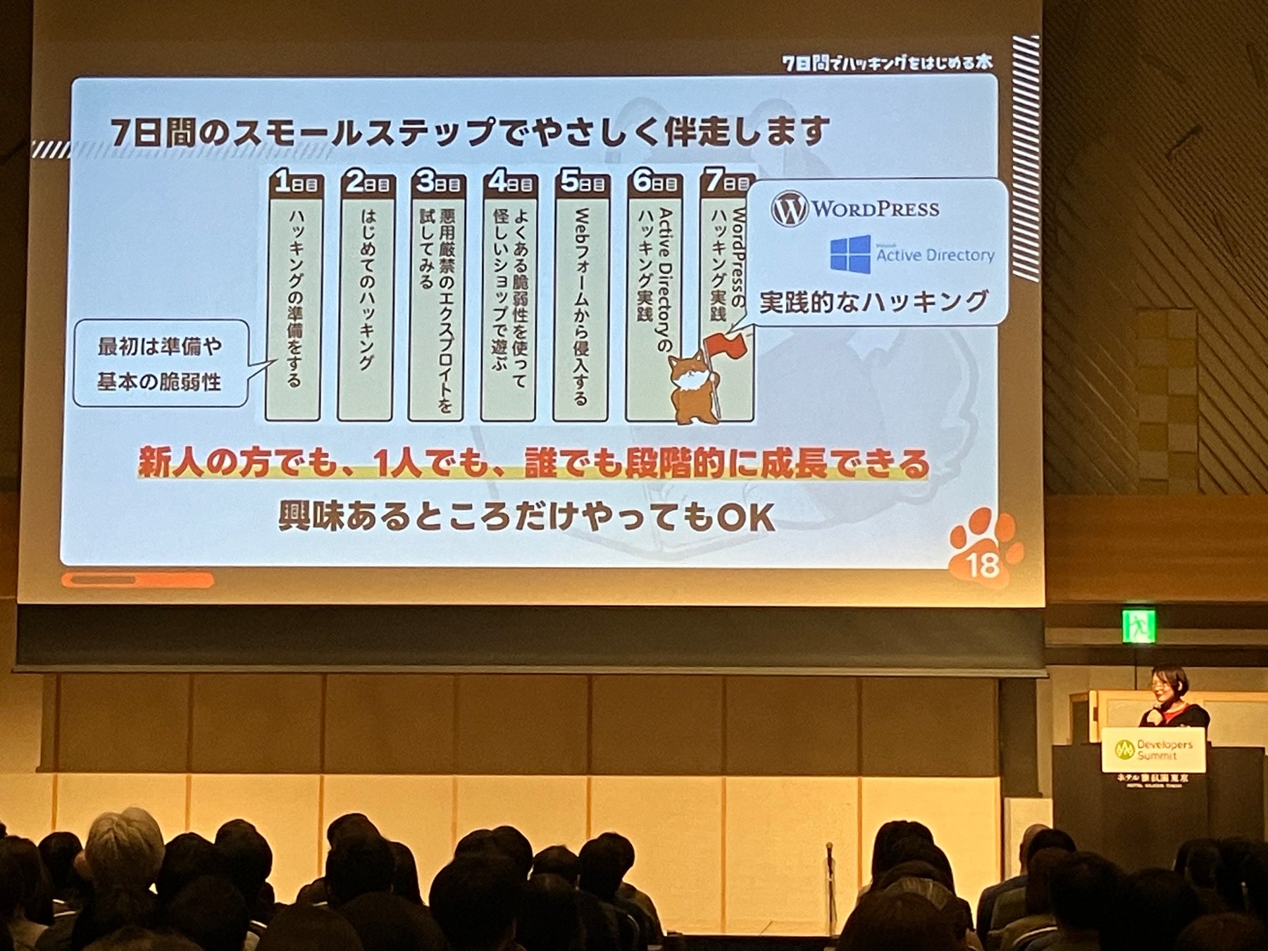 今回技術書部門大賞と特別賞に選ばれた『7日間でハッキングをはじめる本 TryHackMeを使って身体で覚える攻撃手法と脆弱性』は、著者の野溝のみぞう氏が登壇し、「ハッキングを体験するなかでサイバーセキュリティの楽しさを知ってほしい」と呼びかけました。