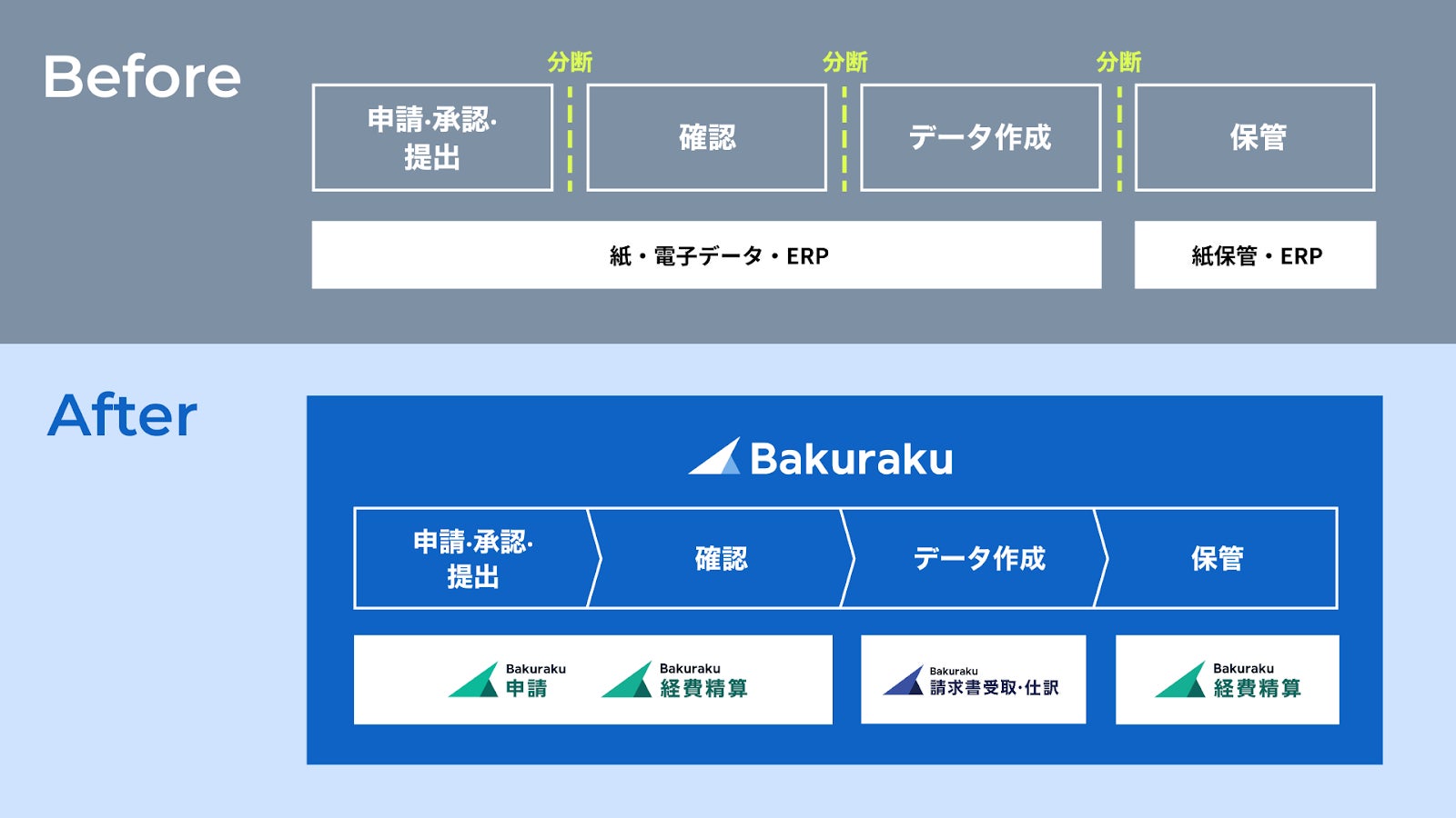 経費精算・請求書処理・法人カード利用を、バクラク内で統合的に管理ができるようになることで、申請から支払・仕訳・電子帳簿保存までがシームレスに繋がり、無駄のない業務プロセスを実現します。
