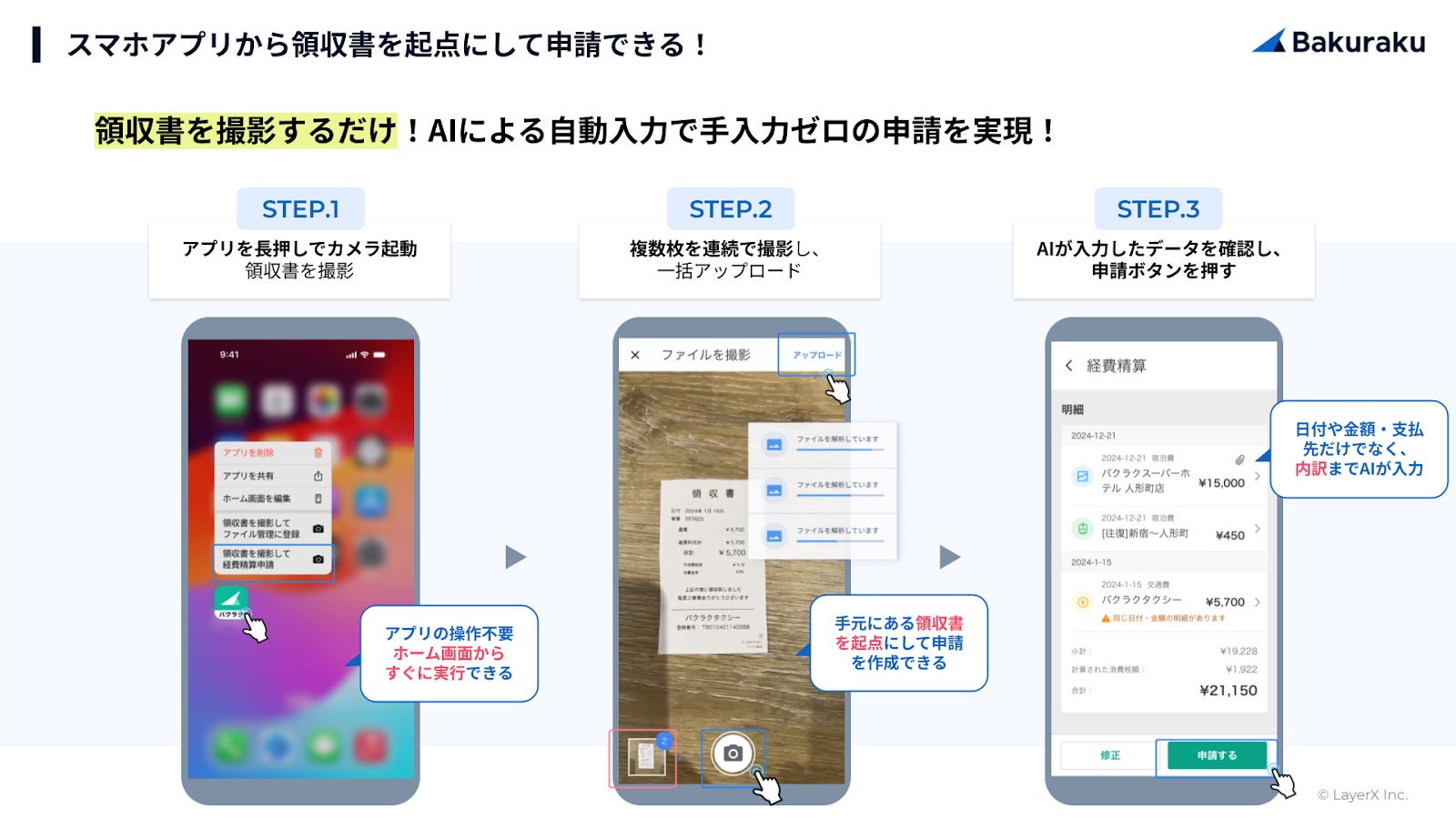 バクラクでは、AI-OCRを用いた領収書・請求書の高精度自動読取により手入力を最小化します。申請者はスマートフォンアプリから撮影した領収書をそのまま提出可能なため、申請作業が大幅にラクになります。