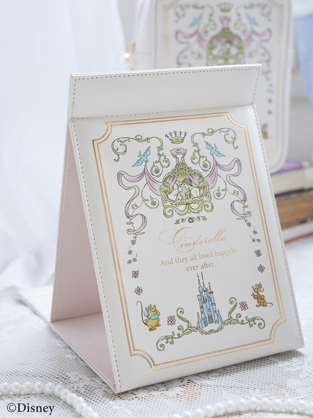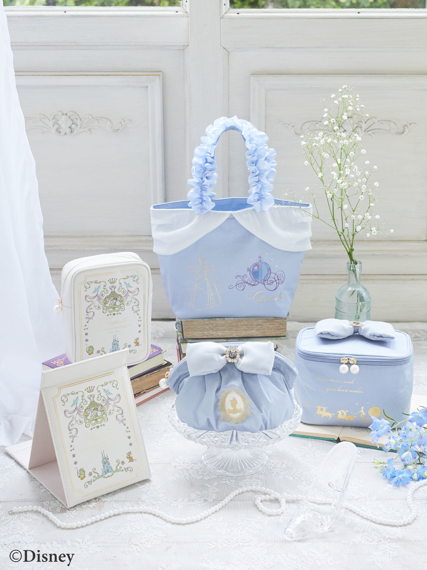それぞれのアイテムには、「魔法でドレス姿に変身する」など、キャラクターが“夢に近づいていく”シーンのプリントや刺繍を施しています。キュートなディテールが気分を高揚させ、これからの梅雨の時期のお出かけに彩りを添えるアイテムに仕上げました。このほか、レザー調のミラーやポーチもラインナップいたします。