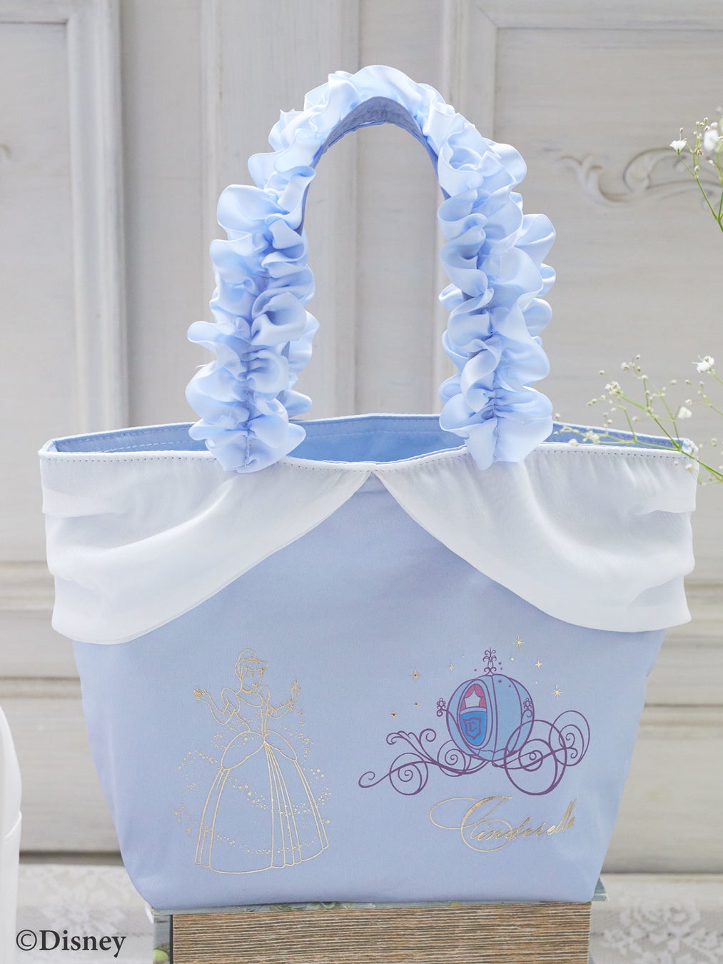 中でも一押しは、サテン地のシリーズです。「シンデレラ」のドレスをイメージし、上品なくすみブルーを採用。定番のトートバッグは、ドレスのオーバースカートから着想を得たオーガンジーの飾りをプラスして、きらびやかな雰囲気に。ポーチは、オーガンジーをまとったリボンを配し、Maison de FLEURならではのビジューやパール使いで、ドレスの華やかさを表現しました。