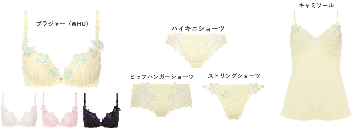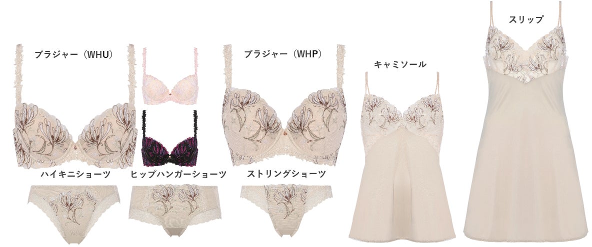 アールヌーボーの曲線がエレガントな香水瓶は、大切に持ち帰った旅の思い出——美しい透明感やカラーがドラマティックなシリーズ。レースは、舞い散るリコリスの花びらを表現しています。ブラジャー(WHU)は、胸寄せ効果が期待できるパターンで谷間をきれいに演出。ブラジャー(WHP)は、豊かなバストをすっきり自然なラインに整えます。