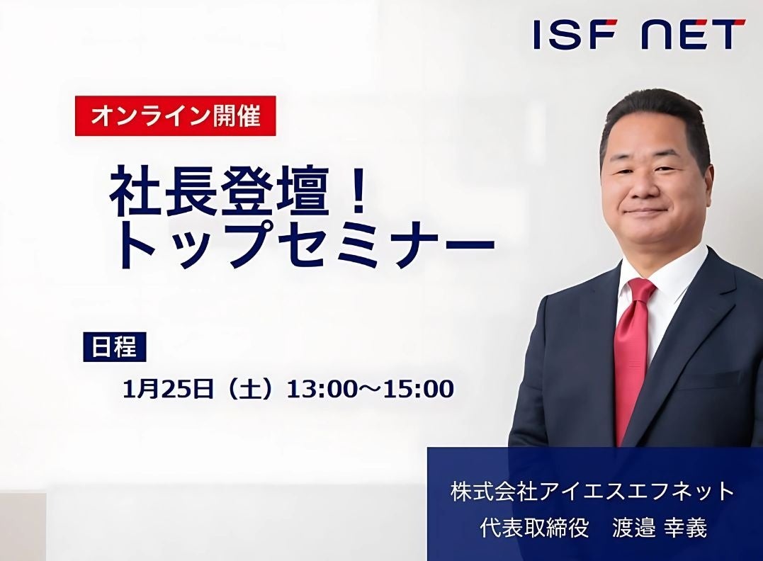 株式会社アイエスエフネット(本社:東京都港区/代表取締役:渡邉幸義、以下アイエスエフネット)は、2025年1月25日(土)に、26年卒向け「社長登壇!トップセミナー」を開催します。当日は代表の渡邉が登壇し、当社の魅力をお伝えします。