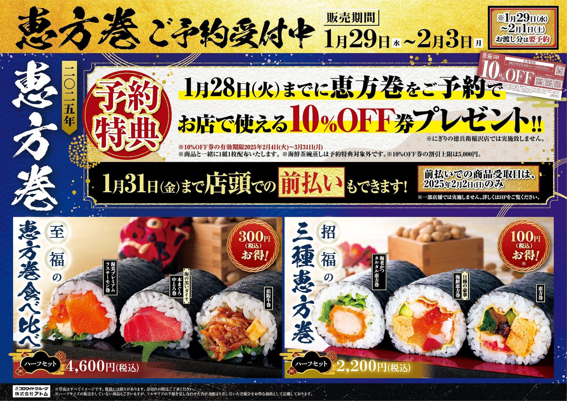 にぎりの徳兵衛など51店舗にて本日から“福を呼ぶ 恵方巻”を予約開始‼ご祈祷海苔使用、さらに予約特典で10%OFF券進呈!~ 販売期間 2025年1月29日(水)~2月3日(月)~