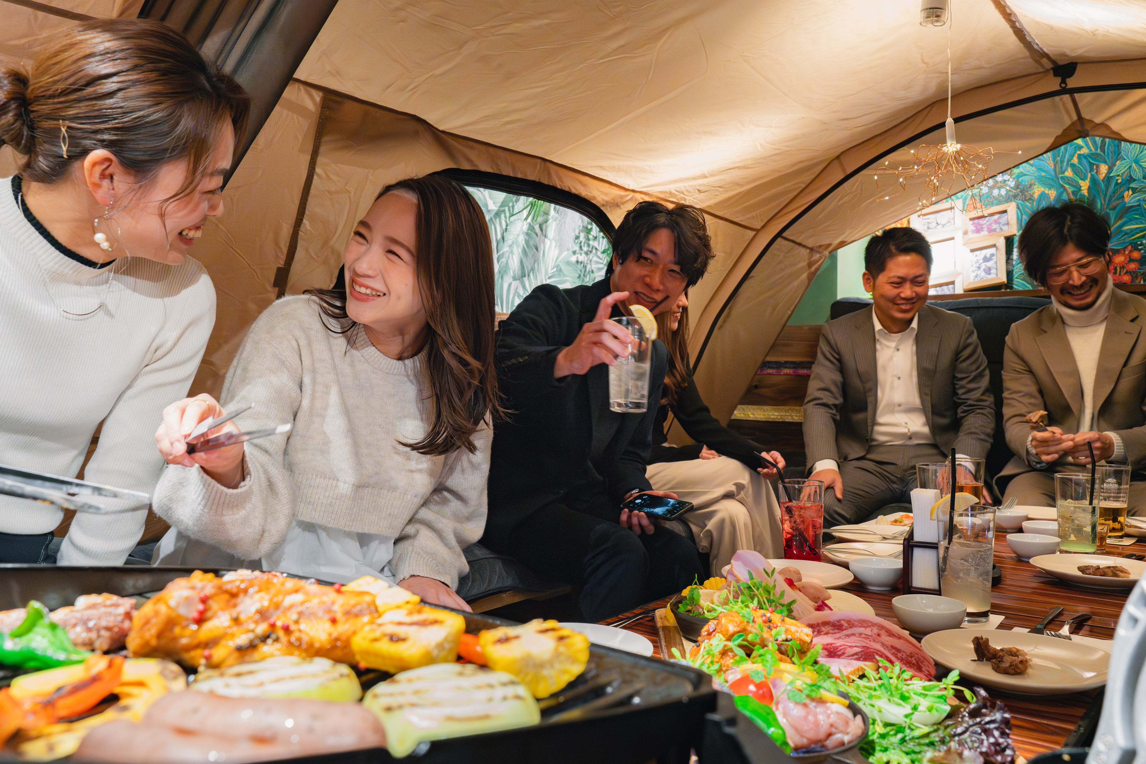 こちらの6階で屋内BBQが楽しめるウッドデザインパーク栄に、グランピング気分を味わえるテントを設置した半個室のお席が誕生しました。