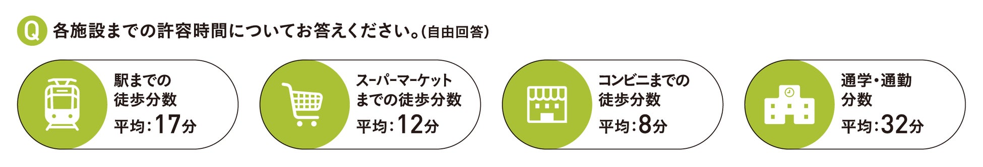 各施設まで徒歩での許容時間を聞いたところ、駅までは平均17分、スーパーマーケットまでは平均12分、コンビニまでは平均8分という結果で、コンビニの近くが良いというニーズがうかがえました。また、通学・通勤先までは平均32分許容できるという結果でした。