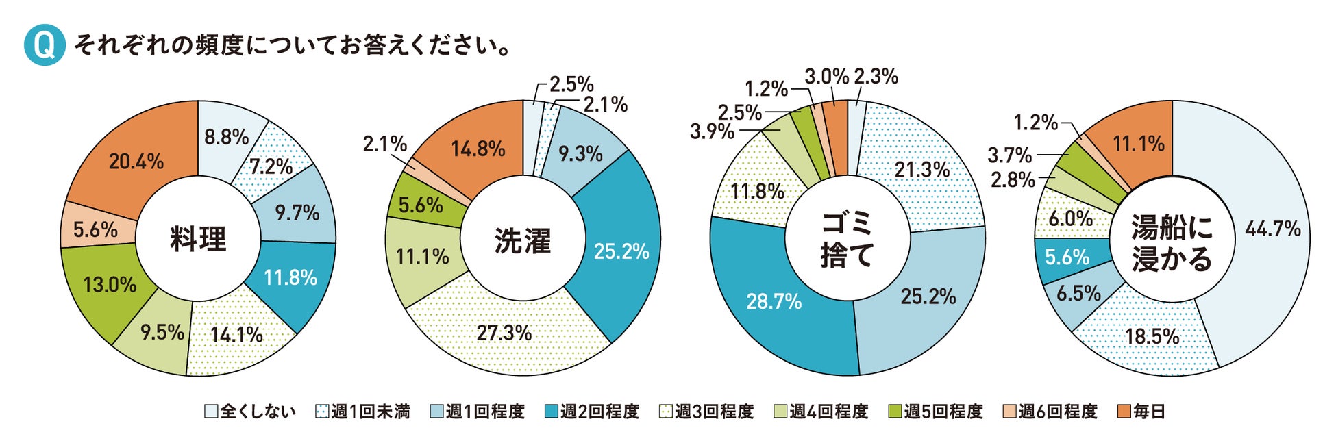 それぞれの頻度について、料理は「毎日」、洗濯は「週3回程度」、ゴミ捨ては「週2回程度」、湯船に浸かるは「全くしない」が最多でした。