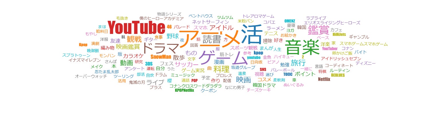 最近はまっていることを自由回答で聴取し、ワードクラウドで表現しました。ワードクラウドは、テキストデータ内でよく使われる言葉を視覚的に表したもので、頻繁に使われる言葉ほど大きく表示されます。