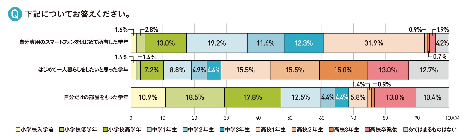 はじめて一人暮らしをしたいと思った時期・学年は高校1~3年生を合計すると46.0%でした。一方、自分だけの部屋をもった学年は小学校入学前が10.9%、小学校低学年・高学年を合計すると36.3%で、半数近くが中学入学前に自分の部屋をもっているようです。