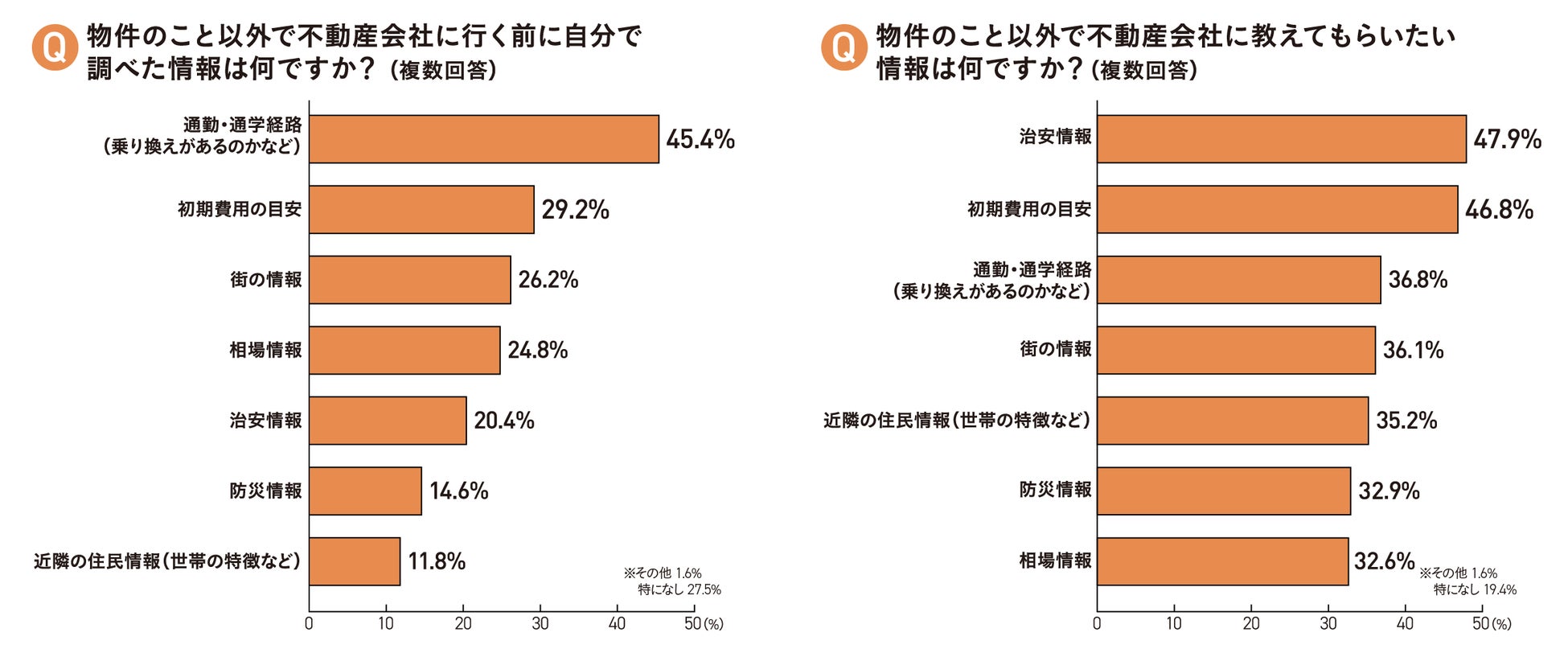 物件のこと以外で、不動産会社に行く前に自分で調べた情報の1位は「通勤・通学経路(乗り換えがあるのかなど)」が1位でした。一方、物件のこと以外で不動産会社に教えてもらいたい情報は「治安情報」が1位で47.9%、次いで「初期費用の目安」が46.8%でした。豊富な経験や専門知識が必要な情報は不動産のプロに教えてもらいたい、という意向が強いようです。