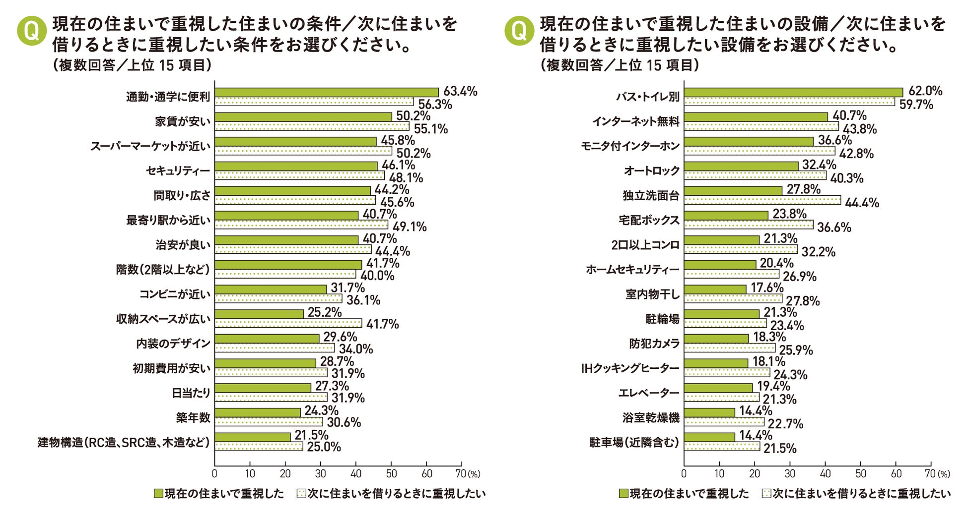 ■重視した住まいの条件「通勤・通学に便利」、設備「バス・トイレ別」が最多