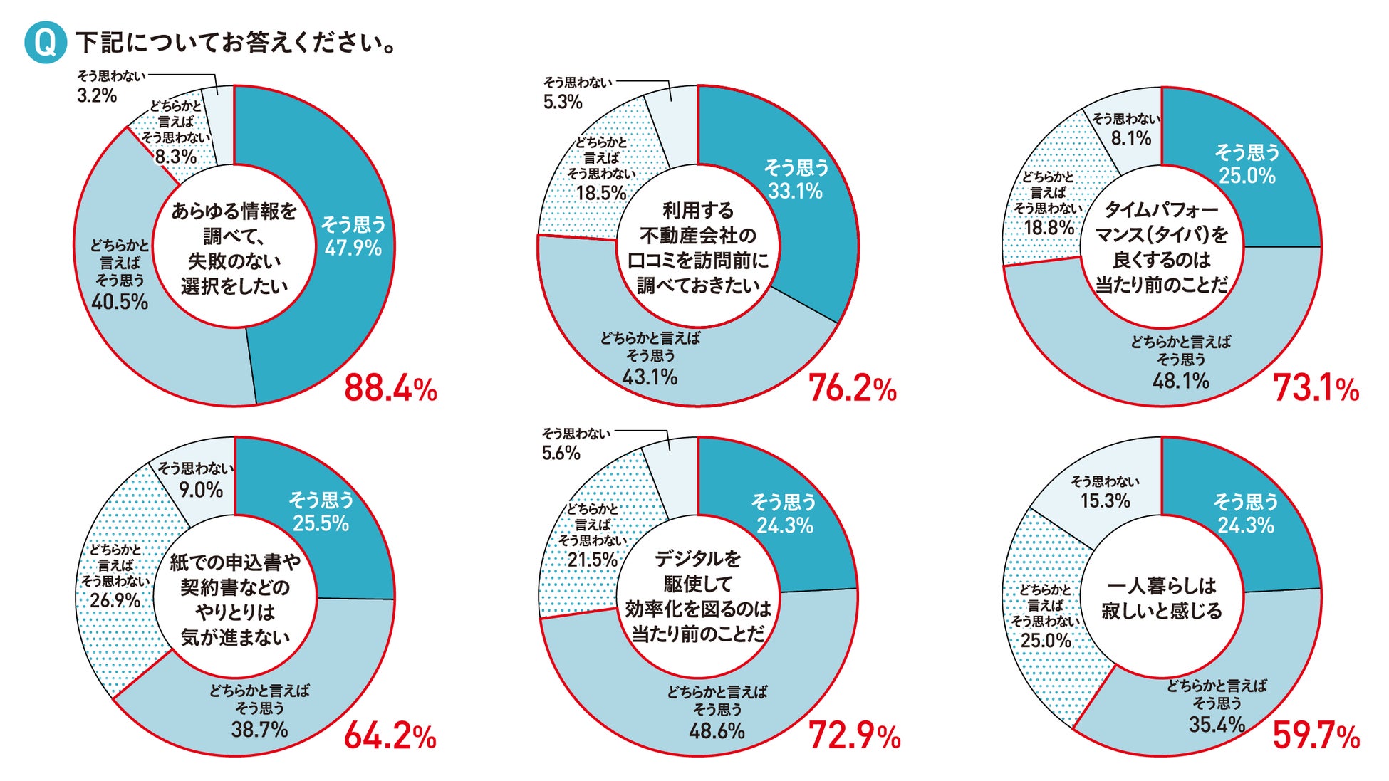 「あらゆる情報を調べて、失敗のない選択をしたい」が「そう思う」「どちらかと言うとそう思う」を合わせると88.4%で、不動産会社の口コミを調べるなど事前調査を積極的に行うデジタルネイティブ世代の特徴が見られました。さらに「紙での申込書や契約書などのやりとりは気が進まない」は6割以上、「デジタルを駆使して効率化を図るのは当たり前のことだ」は7割以上が「そう思う」「どちらかと言えばそう思う」と回答しました。
