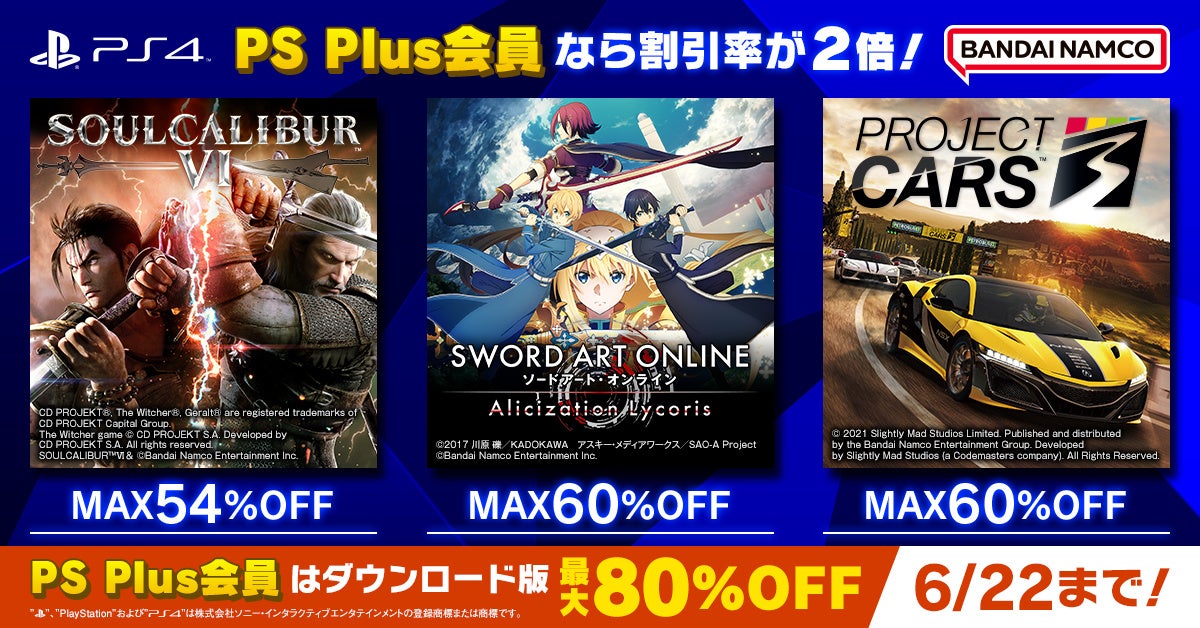 PlayStation™Storeにて株式会社ソニー・インタラクティブエンタテインメントが主催する『PlayStation®Plus Double Discountsセール』では、PS Plus会員なら、「SOULCALIBUR Ⅵ デラックスエディション2019」が54%OFFの4,300円(税込)、「ソードアート・オンライン アリシゼーション リコリス」が60%OFFの3,344円(税込)、「PROJECT CARS 3 Deluxe Edition」が60%OFFの5,104円(税込)とお得にお買い求めいただけます。