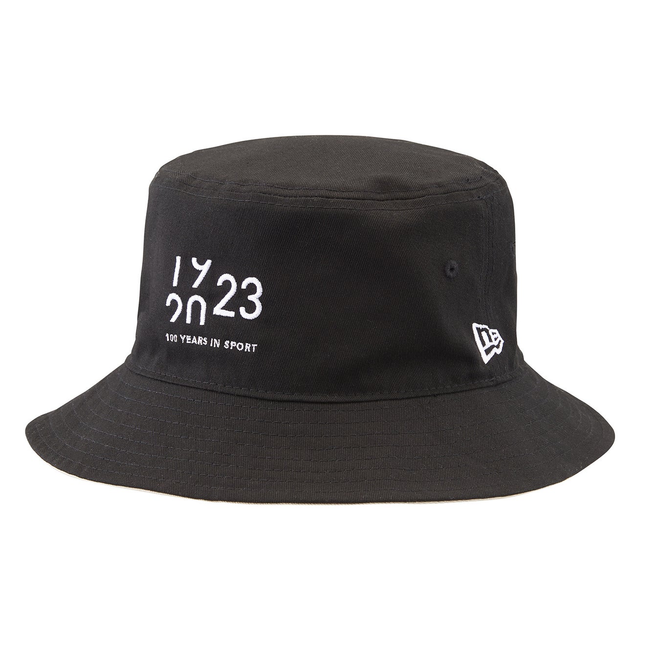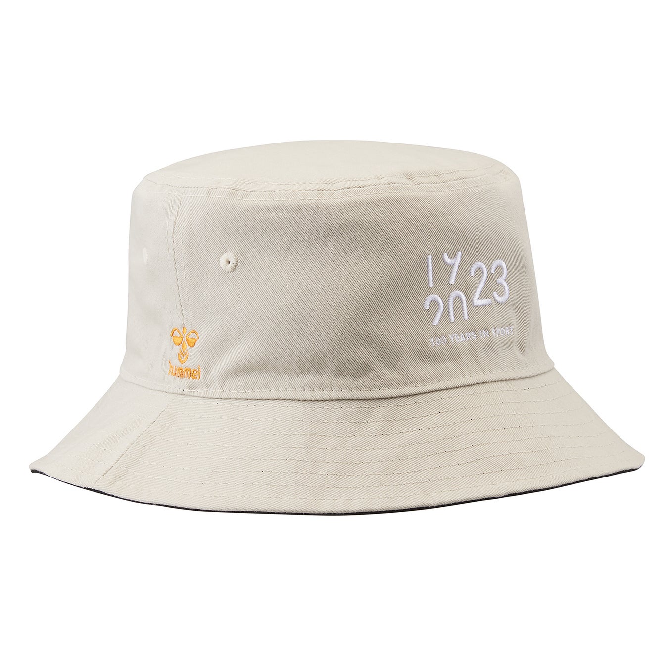 リバーシブル仕様のバケットハット。ブランド100周年を迎えるヒュンメルの100th記念ロゴ入り。