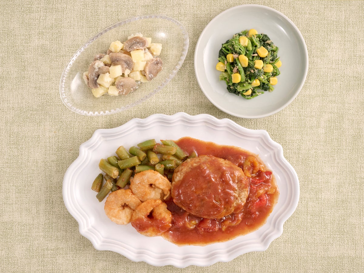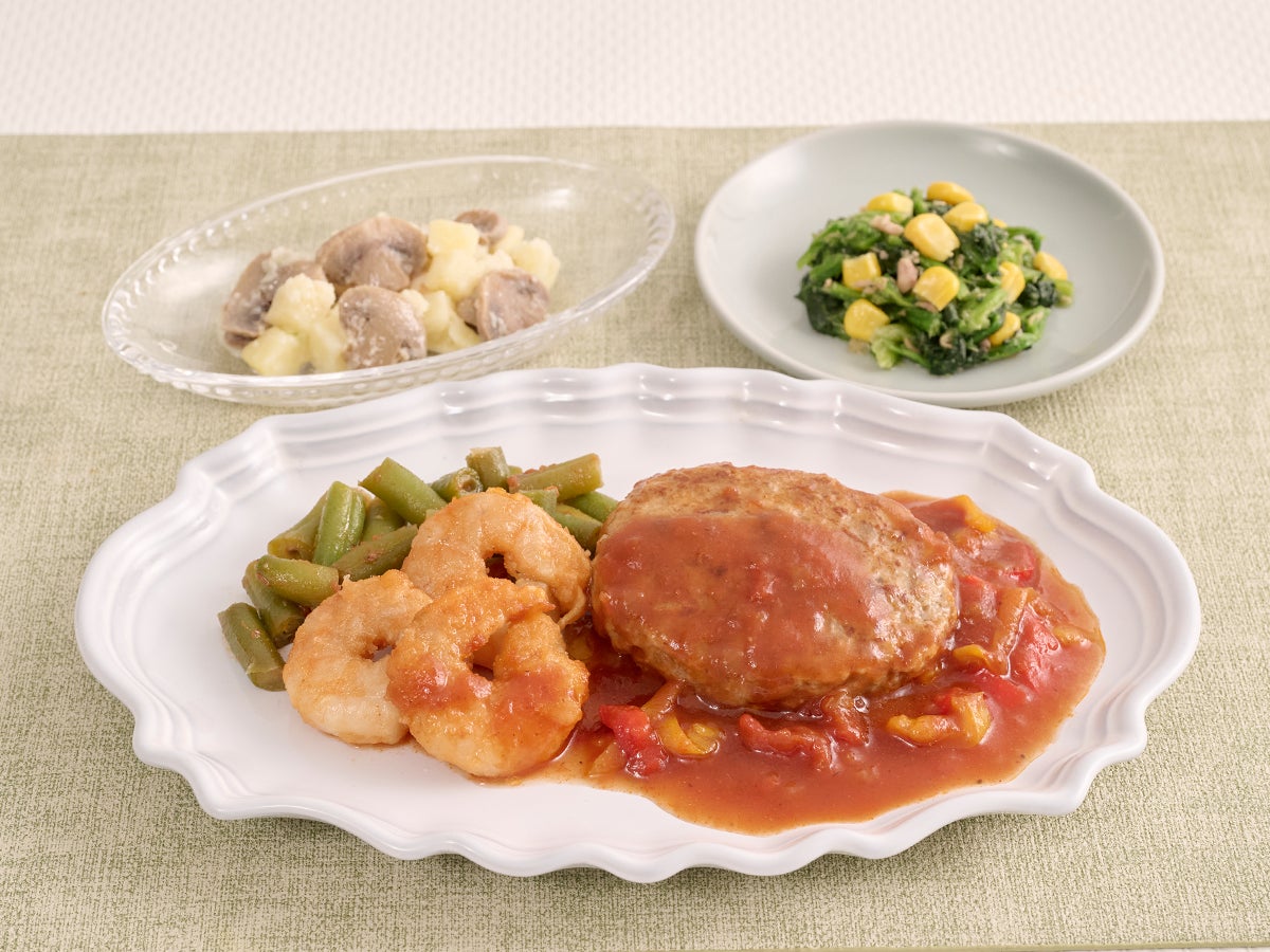ボリューム満点のメニューが遂に登場!酸味とコクが絶妙なトマトデミソースをたっぷり使用した「ハンバーグ&小海老フライの大人様ランチ」がナッシュから新発売