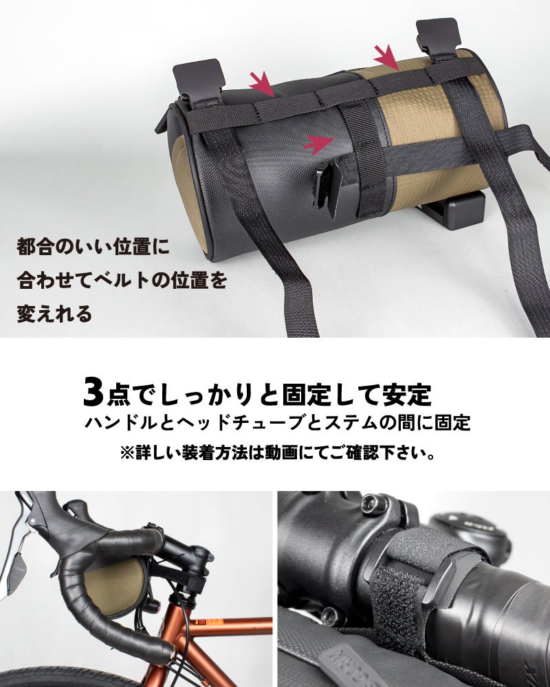 ベルトでハンドルに2点に固定し、プラスでヘッドチューブとステムの間に固定する事ができます。