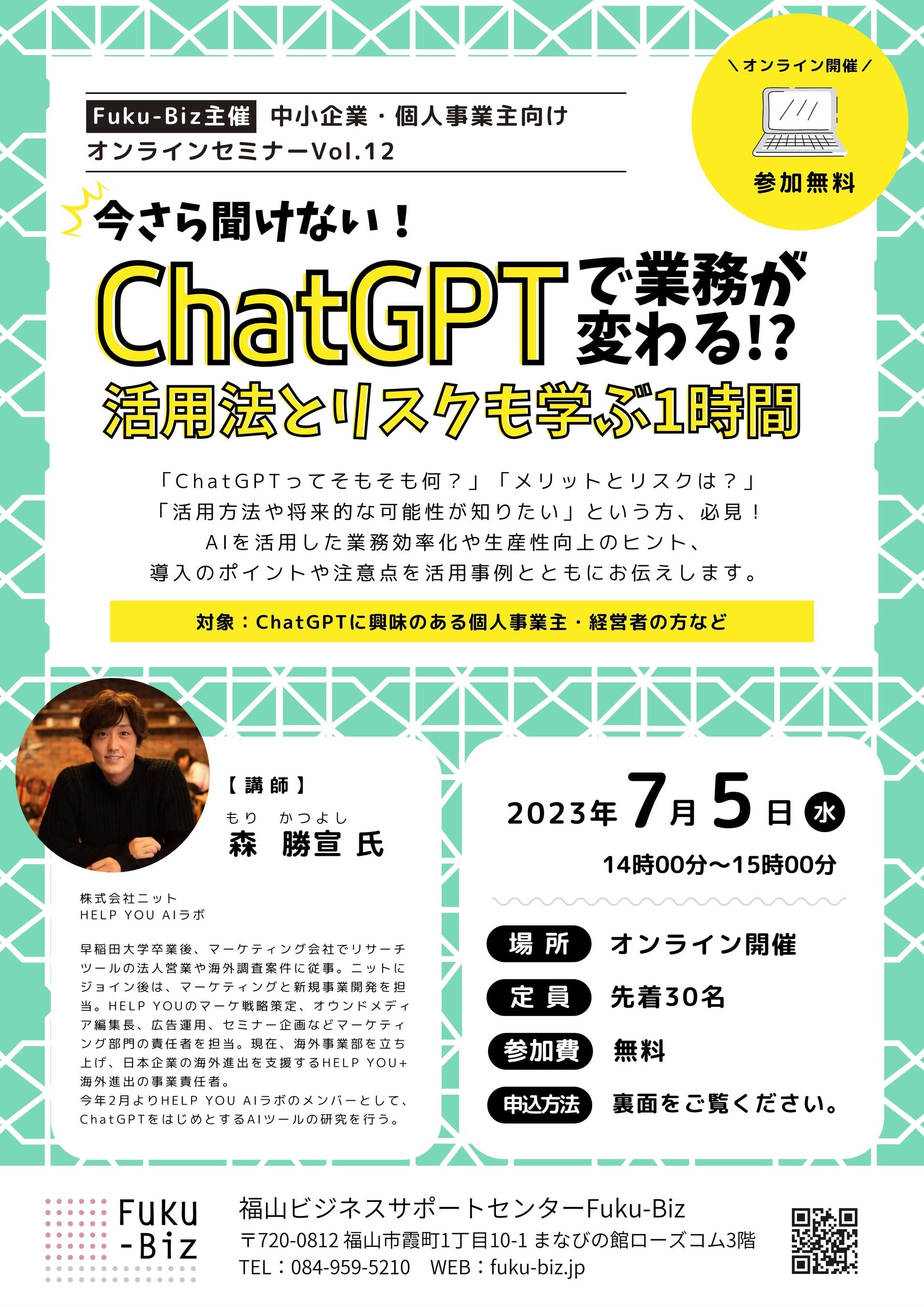 このたび7月5日(水)に、広島県福山市『福山ビジネスサポートセンター Fuku-Biz』主催のオンラインセミナー「今さら聞けない!ChatGPTで業務が変わる!?活用法とリスクも学ぶ1時間」に、HELP YOU AIラボの森 勝宣が講師として登壇します。2月にHELP YOU AIラボを立ち上げた弊社が、AIを使って業務効率化・生産性向上を実現する際の、ChatGPT活用法やリスクを事例とともにお伝えします。