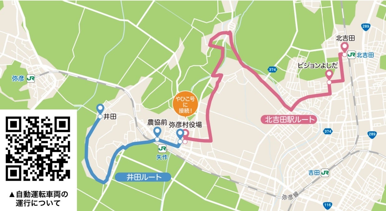 「MiCa」は、弥彦村役場を起点とする北吉田ルート(片道約5.7km)と井田ルート(片道約2.5km)の2つのルートを走行します。どちらのルートも住宅地などを通り、弥彦村役場のバス停で「やひこ号」に接続します。また、北吉田ルートでは「北吉田駅」のバス停でJR北吉田駅に接続します。