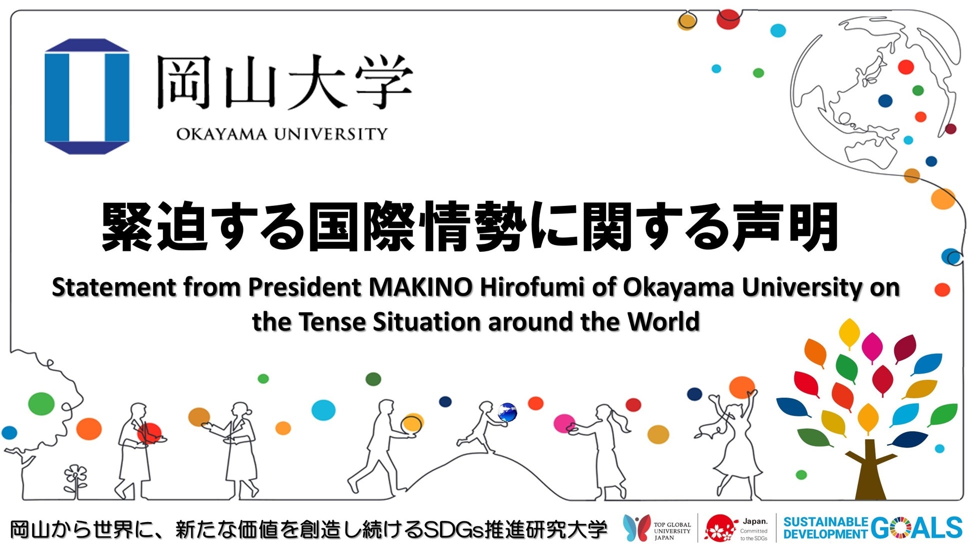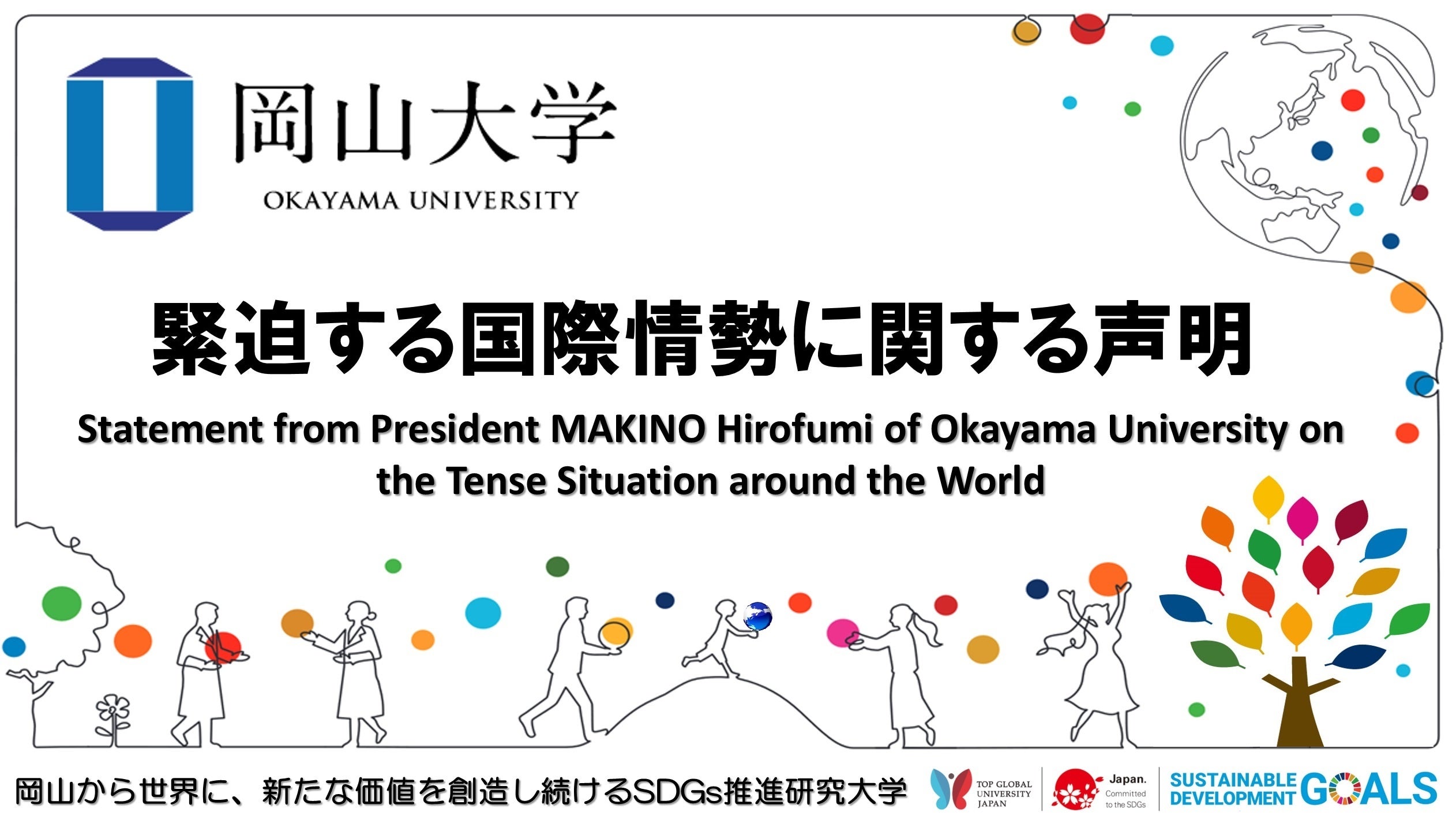 急速に緊迫している国際情勢について、岡山大学を代表して、深刻な懸念を表し、SDGs推進を掲げる大学として、いかなる理由があっても、人道上の危機をもたらす戦争には断固として反対であることを、改めて表明します。