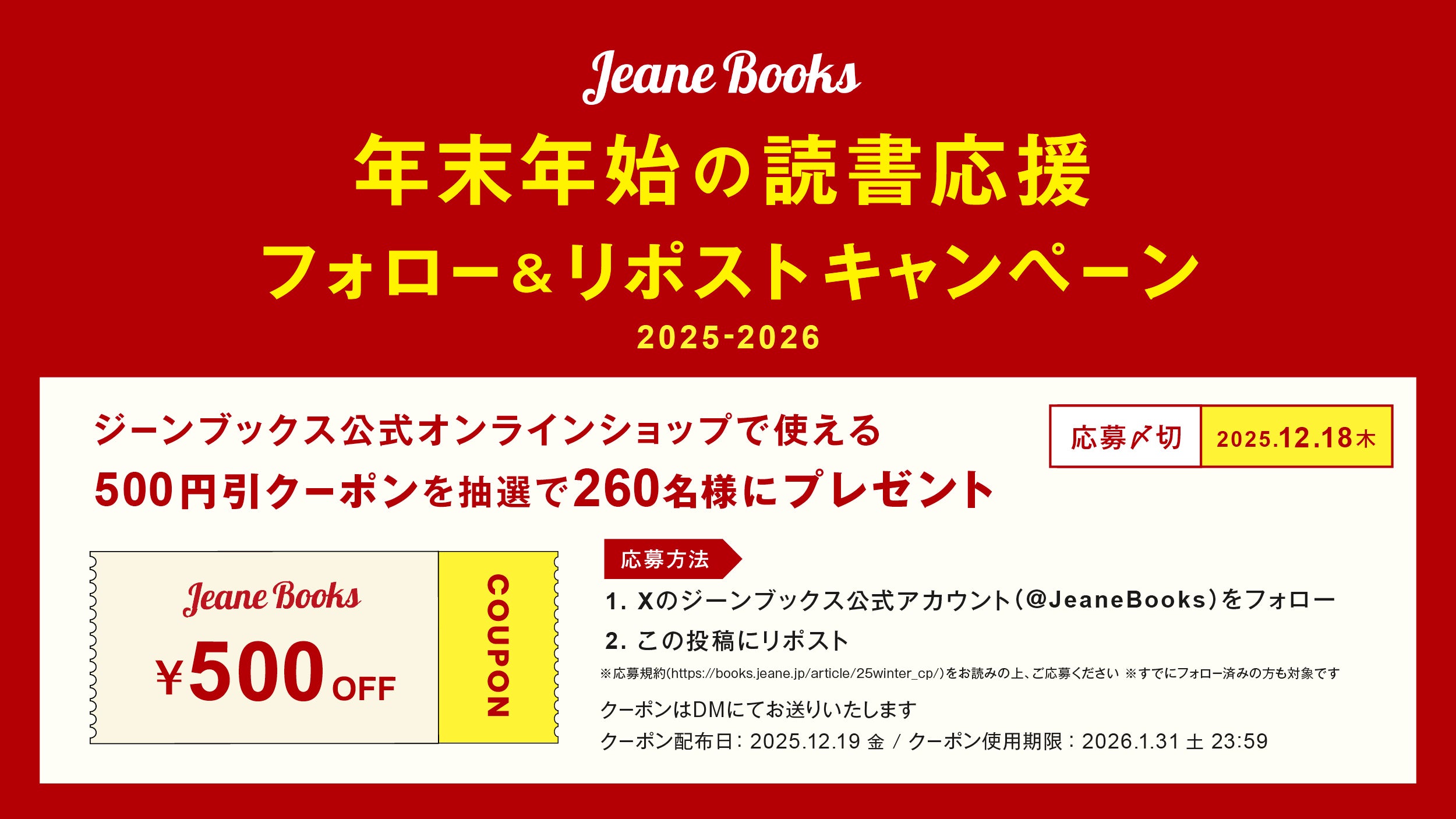 ジーンブックス公式オンラインショップで使える割引クーポンが抽選で当たる「Jeane Books 年末年始の読書応援キャンペーン」(https://books.jeane.jp/article/25winter_cp/)が開催中!